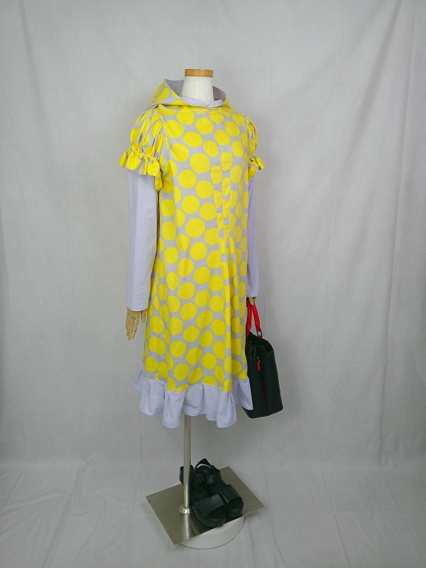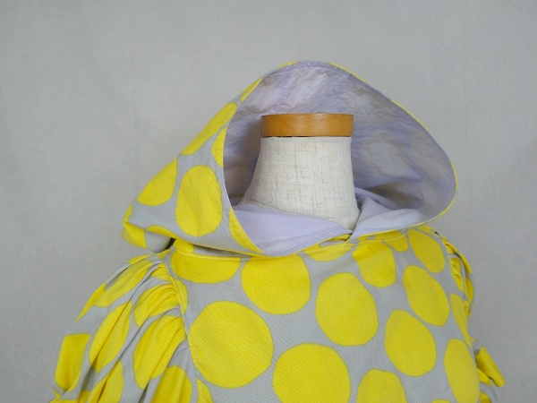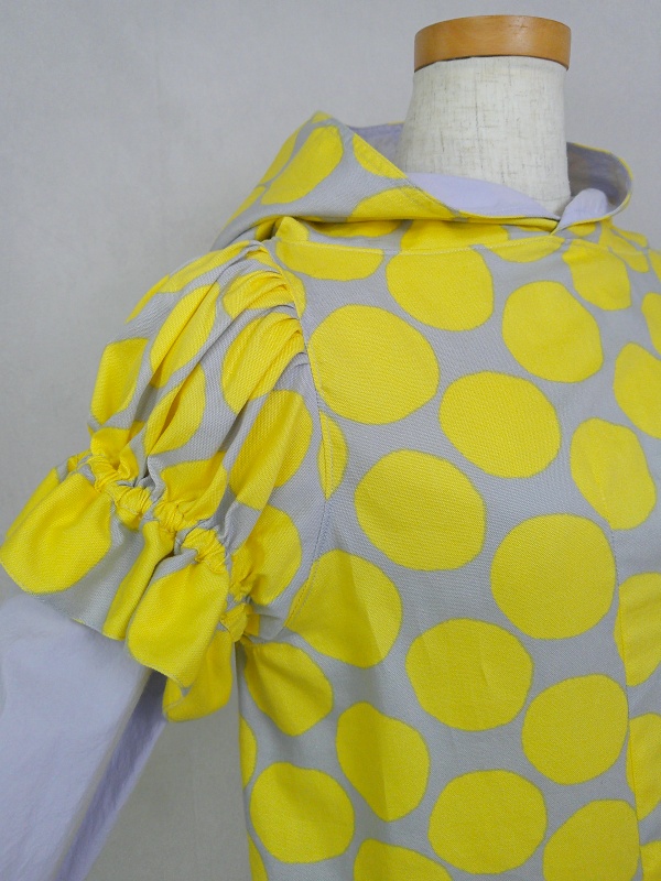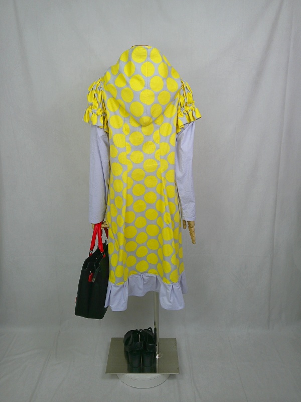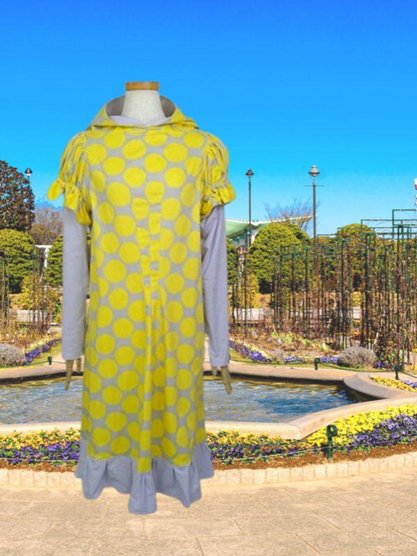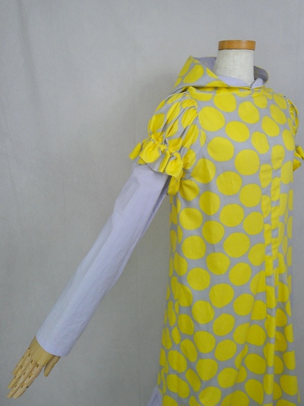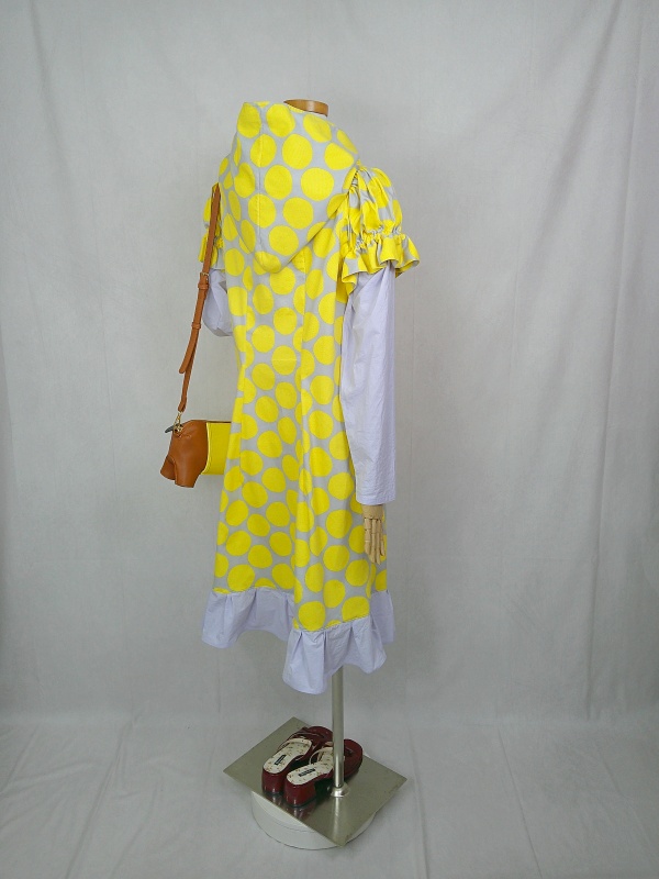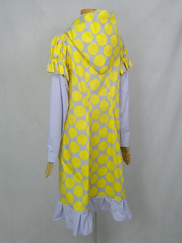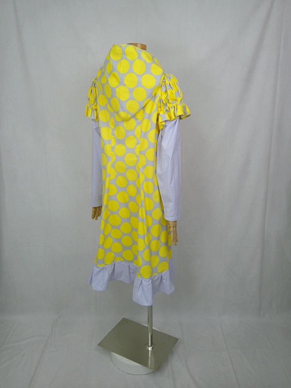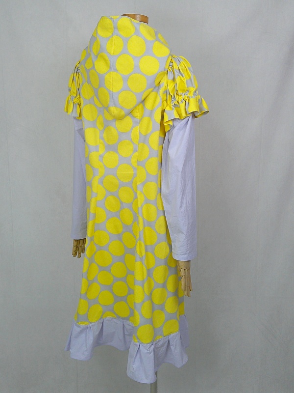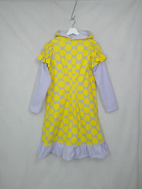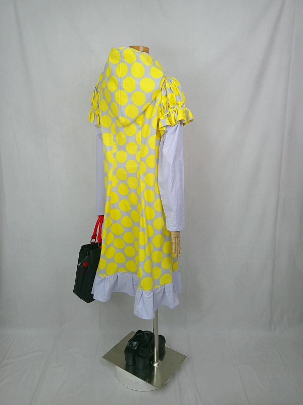 胸と背中にタックを入れた、きれいなシルエットのワンピースは、色々な表情を見せる大きなフードや、黄色の大きな水玉模様、絞りのない袖口のダブルスリーブ、裾に施した少し多きめなフリルなどが、大人のかわいらしさを演出しています。