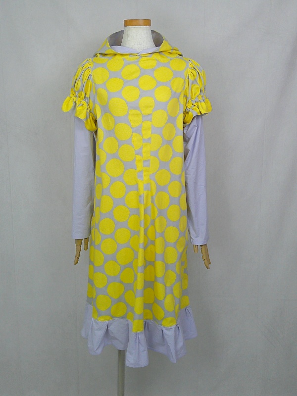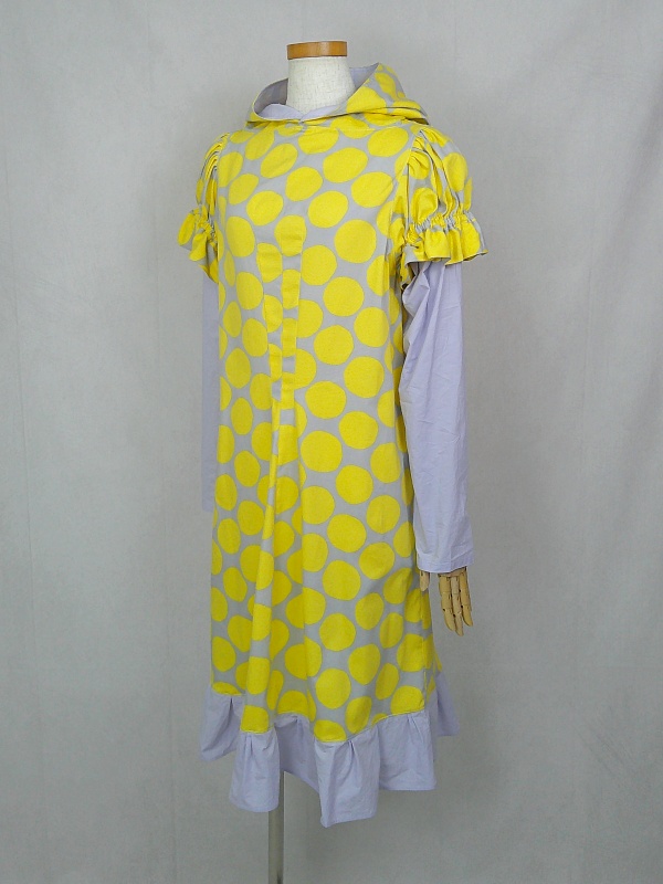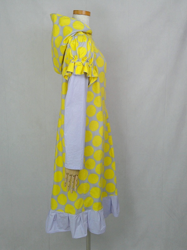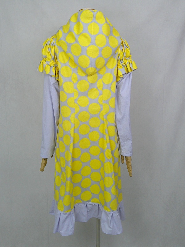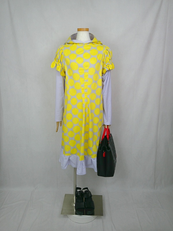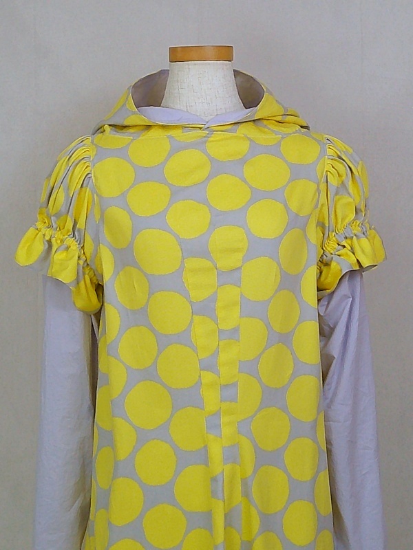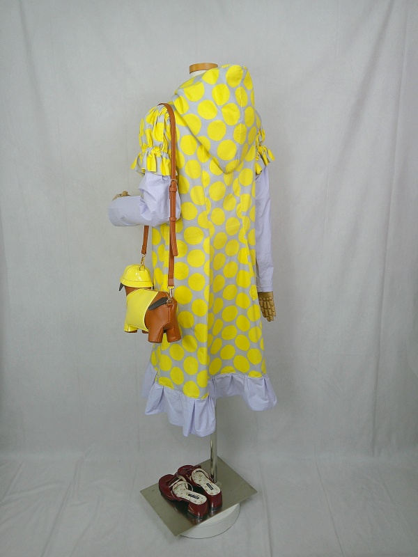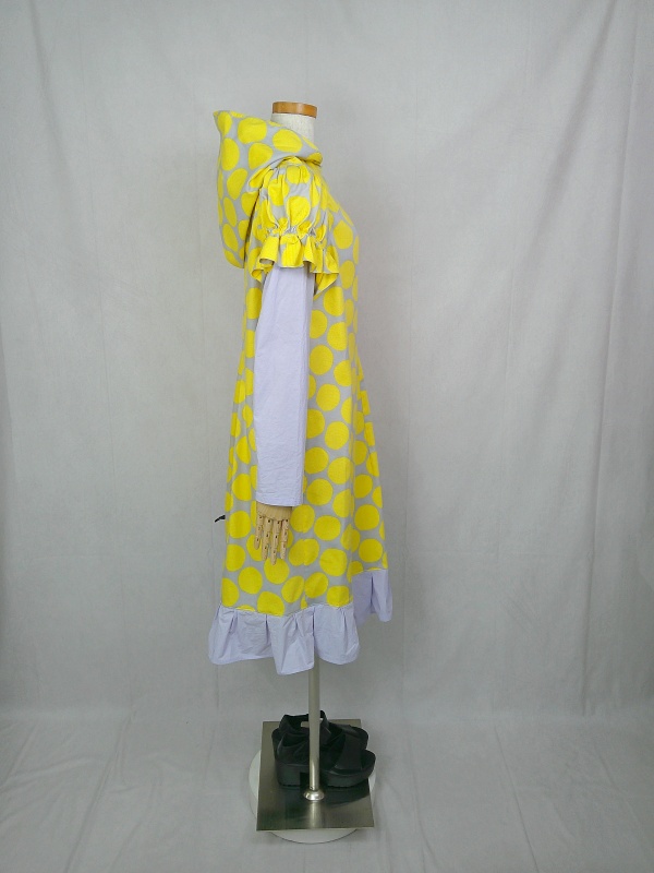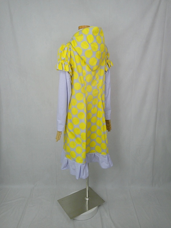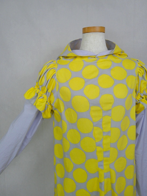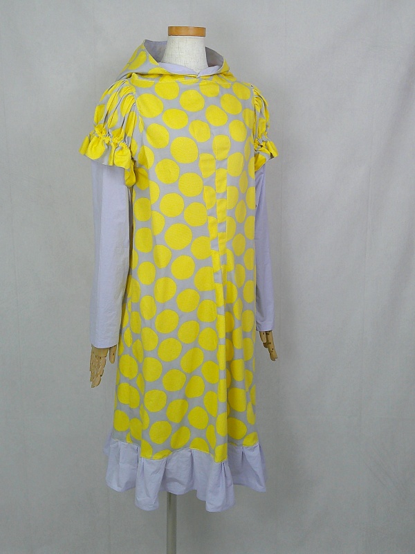 胸と背中にタックを入れた、きれいなシルエットのワンピースは、色々な表情を見せる大きなフードや、黄色の大きな水玉模様、絞りのない袖口のダブルスリーブ、裾に施した少し多きめなフリルなどが、大人のかわいらしさを演出しています。