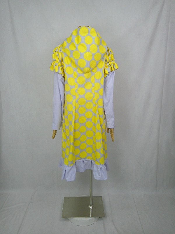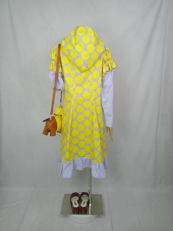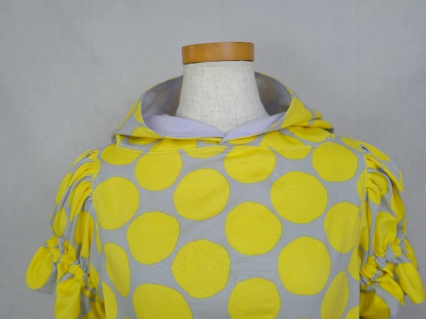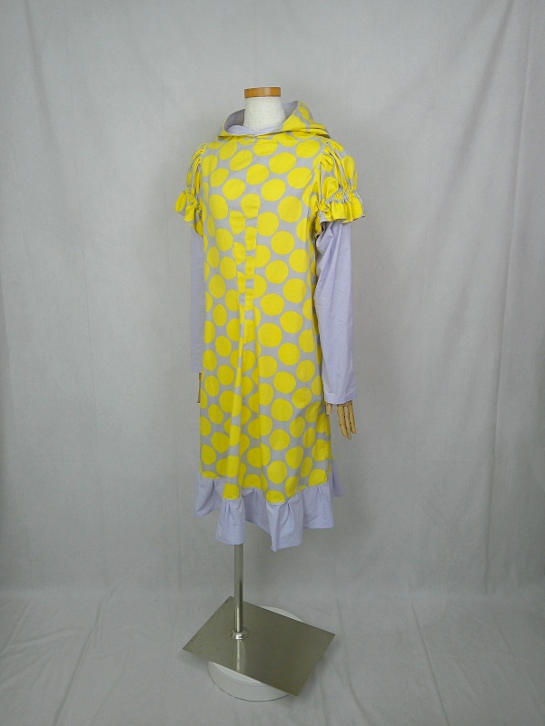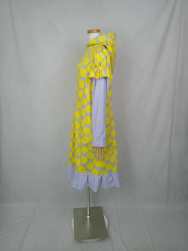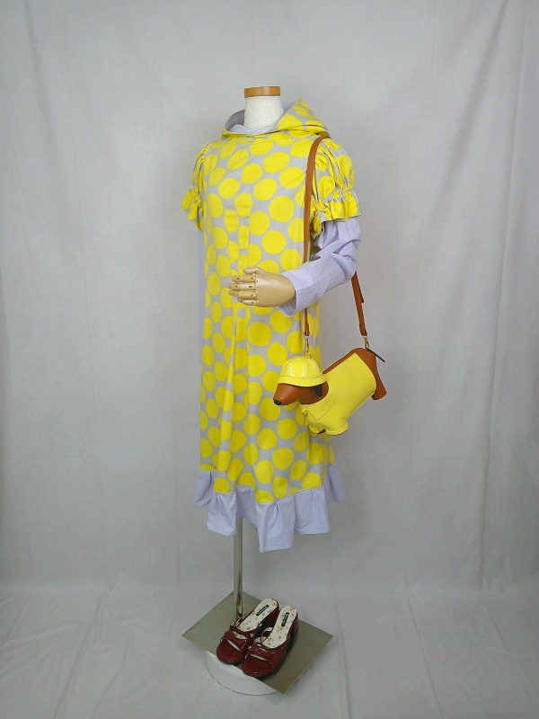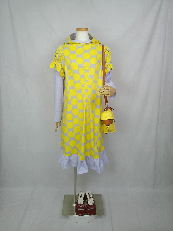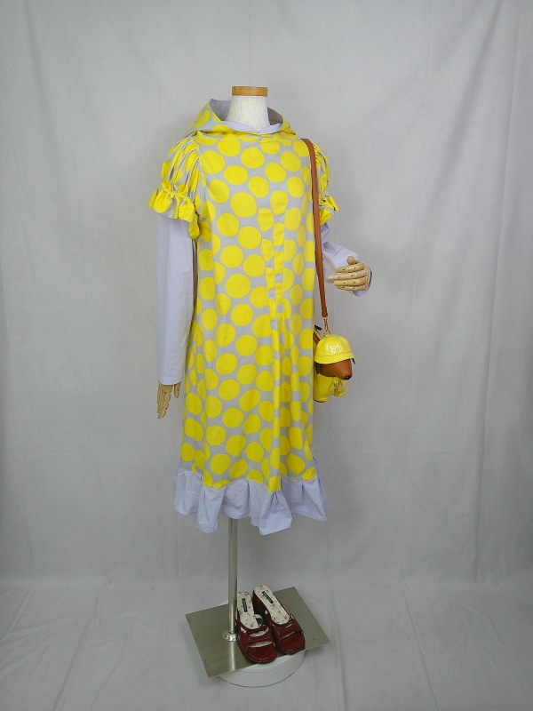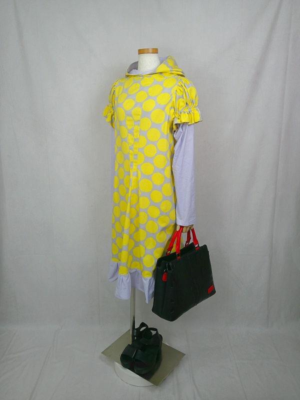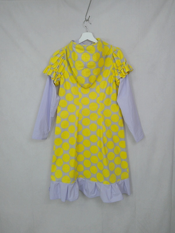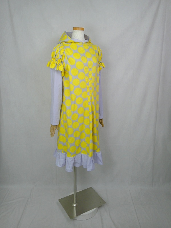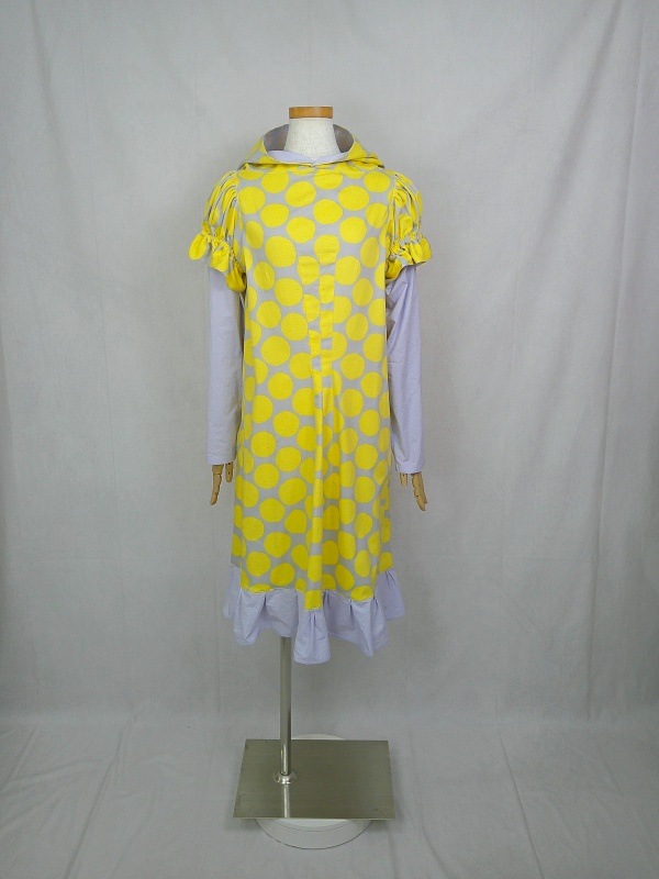 胸と背中にタックを入れた、きれいなシルエットのワンピースは、色々な表情を見せる大きなフードや、黄色の大きな水玉模様、絞りのない袖口のダブルスリーブ、裾に施した少し多きめなフリルなどが、大人のかわいらしさを演出しています。