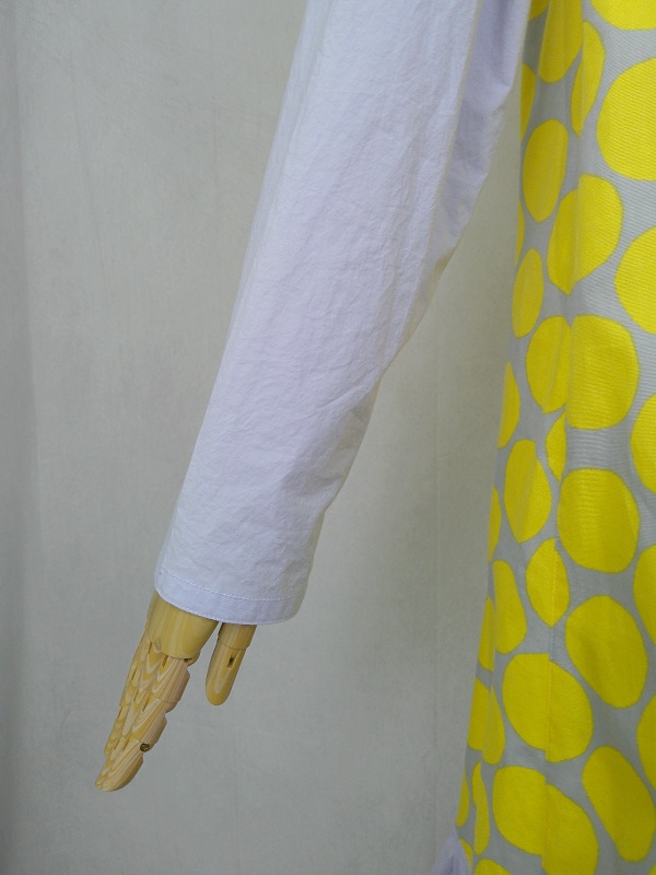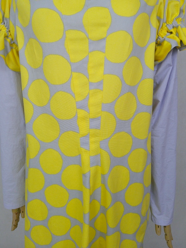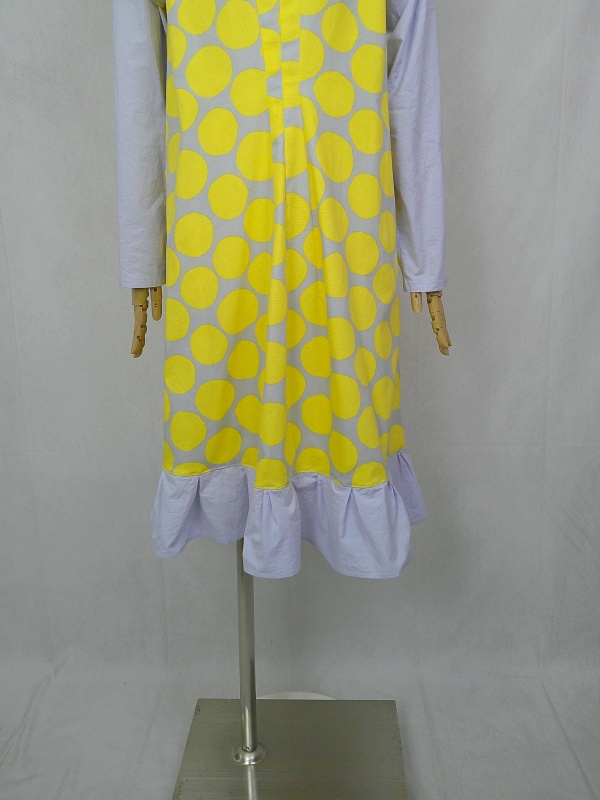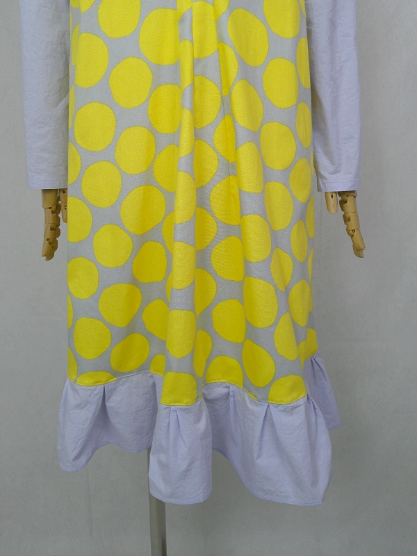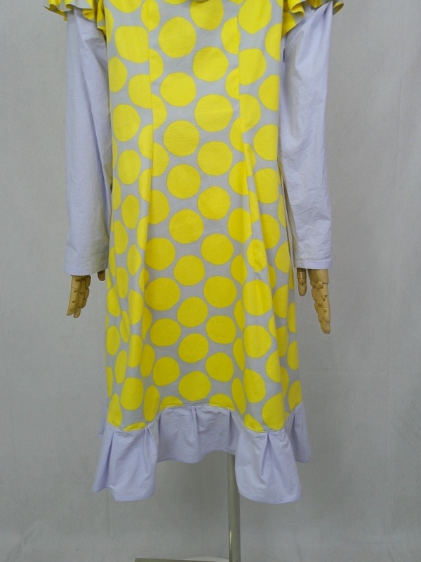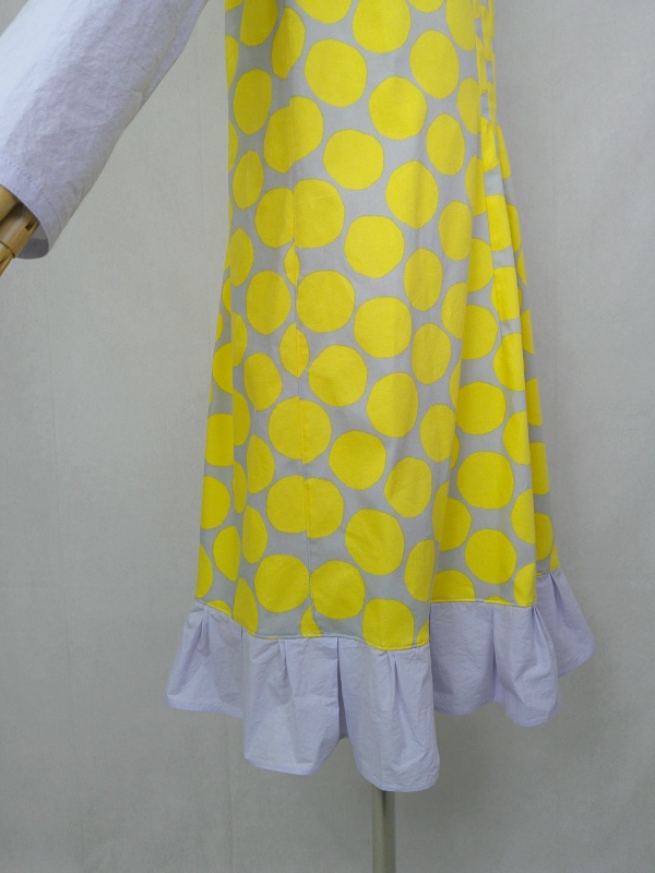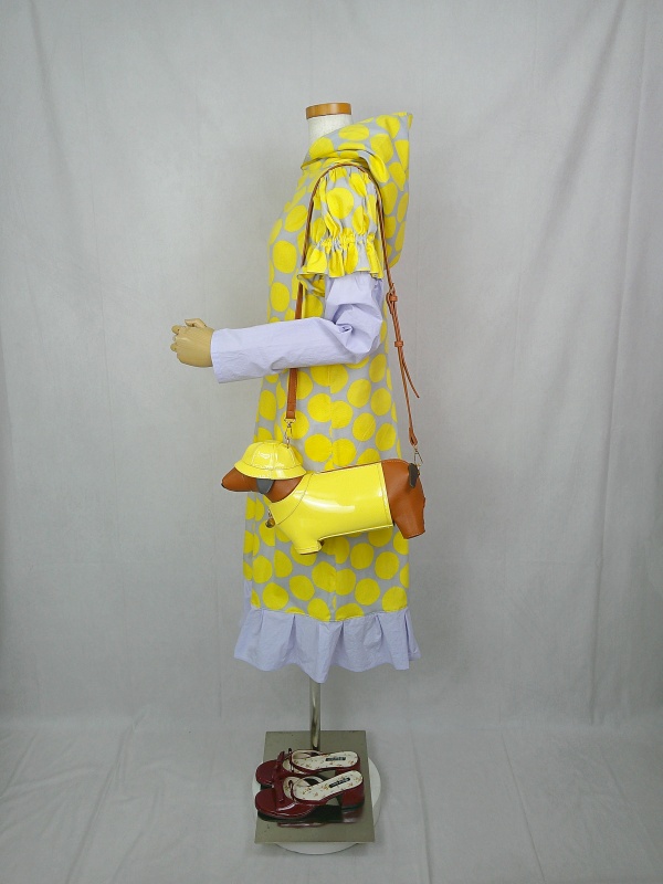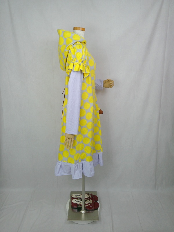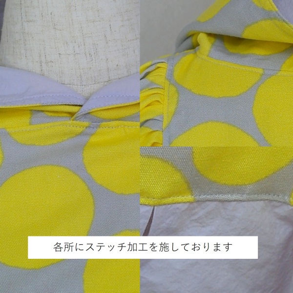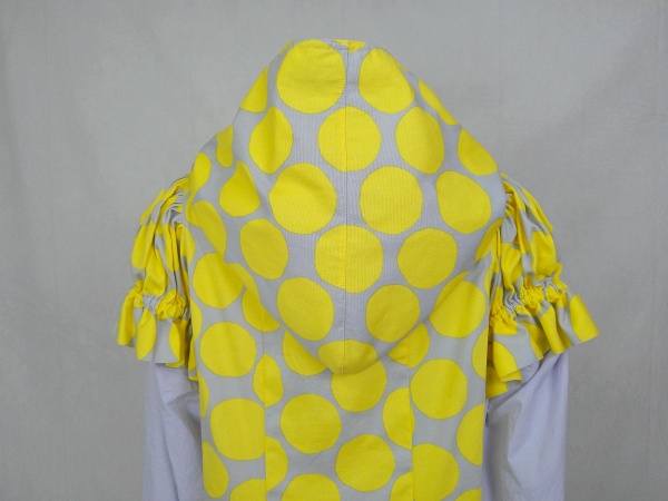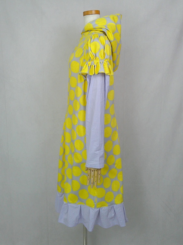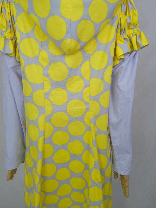 胸と背中にタックを入れた、きれいなシルエットのワンピースは、色々な表情を見せる大きなフードや、黄色の大きな水玉模様、絞りのない袖口のダブルスリーブ、裾に施した少し多きめなフリルなどが、大人のかわいらしさを演出しています。