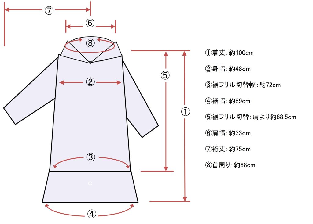 着丈:約100cm 身幅:約48cm 裾幅:約89cm 肩幅:約33cm 裄丈:約75cm 裾フリル切替:肩から約88.5cm 裾フリル幅:約72cm 首周り:約68cm