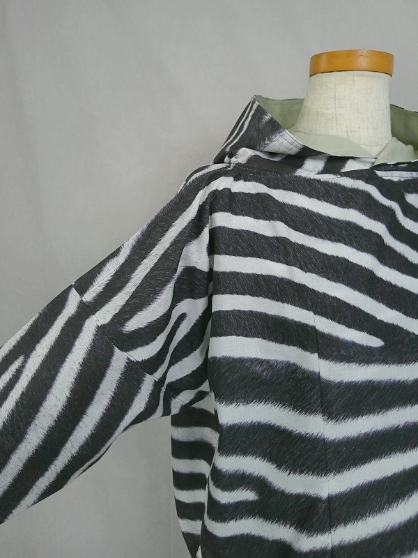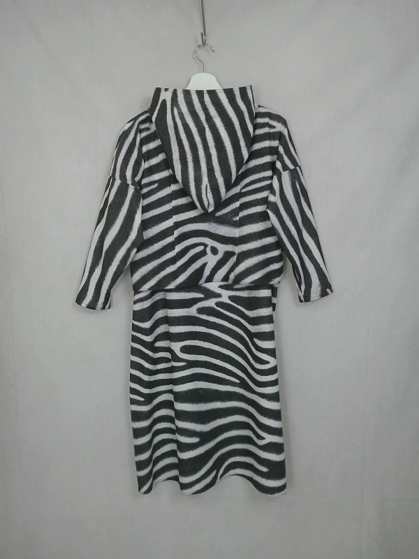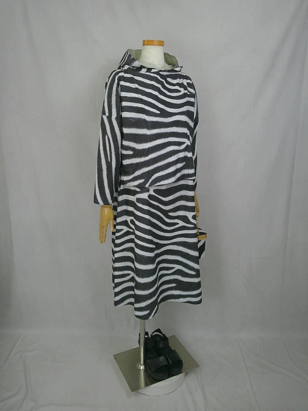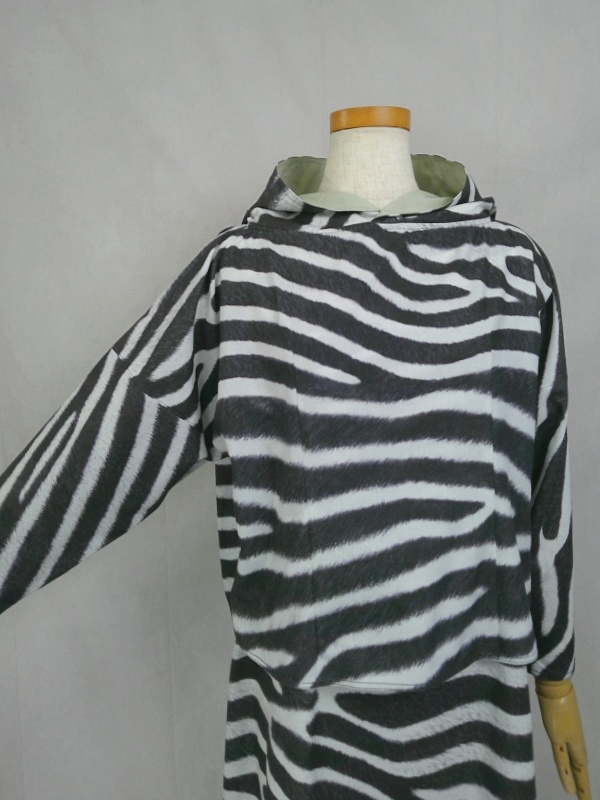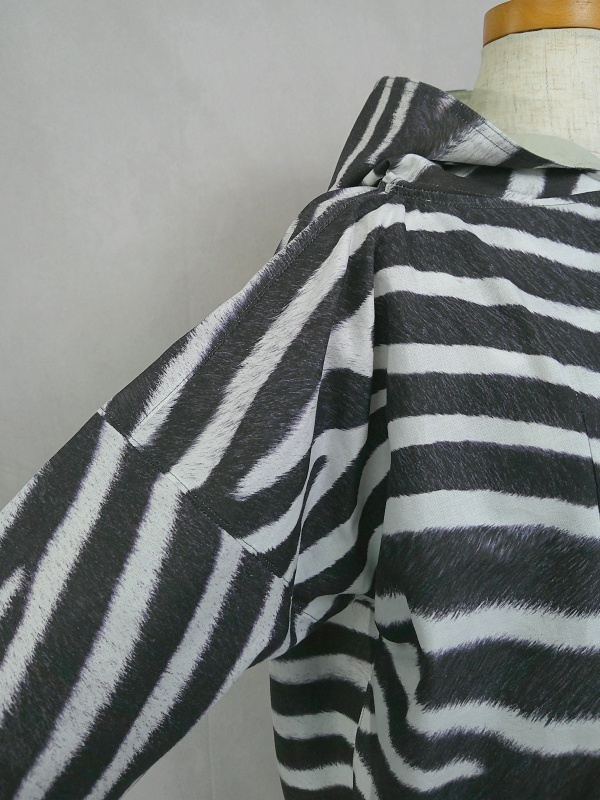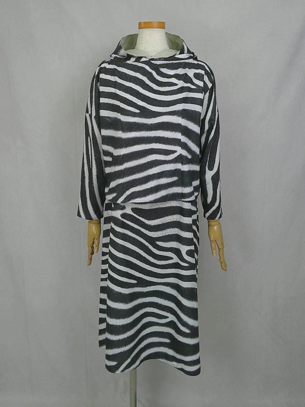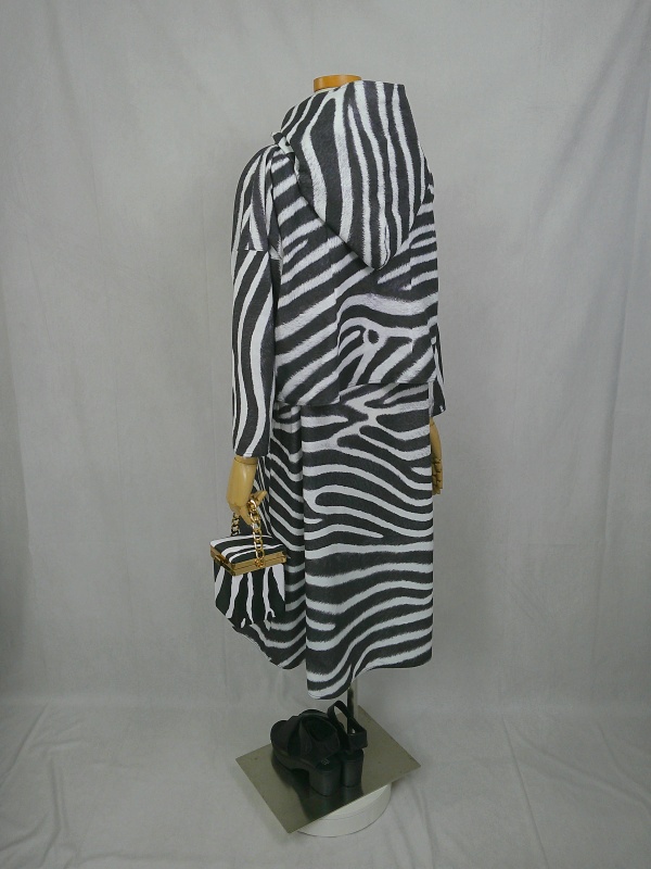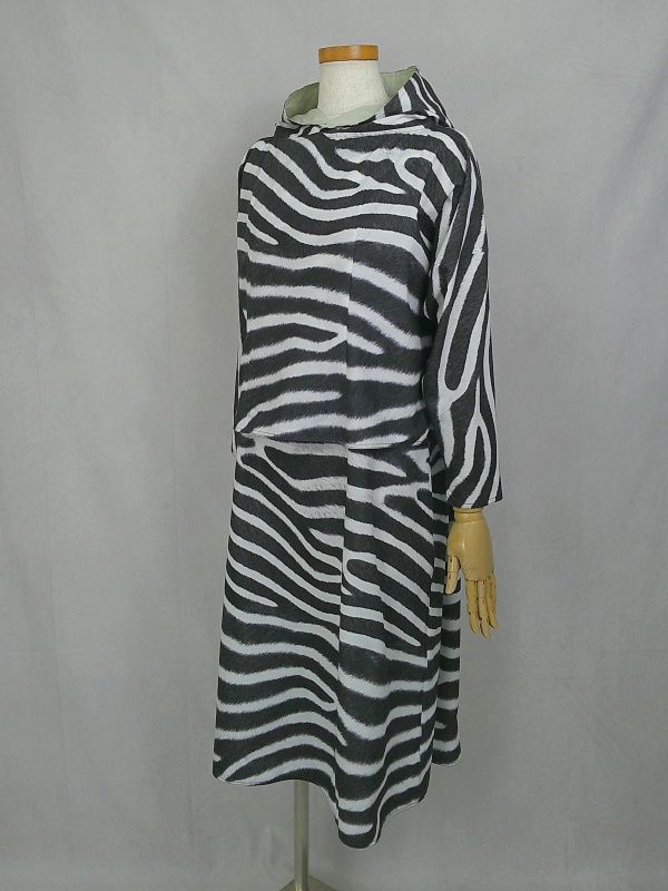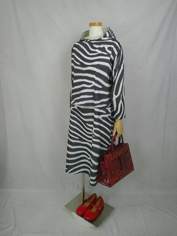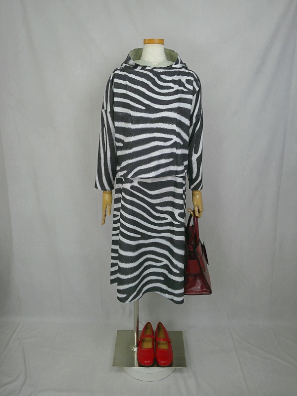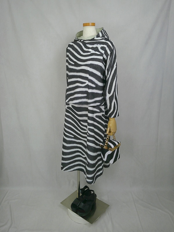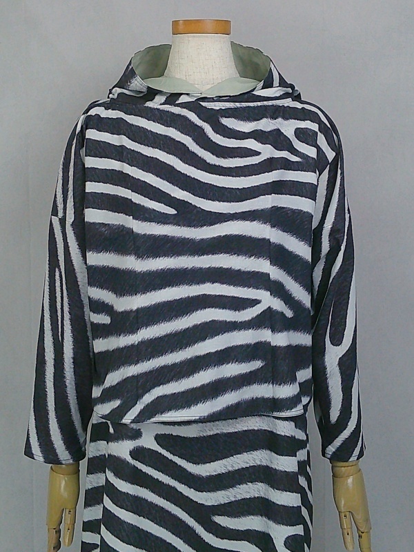 ゼブラ柄のショート丈フードブラウスは、胸の位置から入れたタックが生み出すキレイなシルエットや、内側に無地生地を用いたいろいろな表情を見せるフード、ドロップショルダー&すっきりとした袖口のデザインなどがオシャレに見せ、控えめに広がるAラインのミディ丈インナーワンピースとの組み合わせは、より高級感のあるエレガントな雰囲気を演出しています。