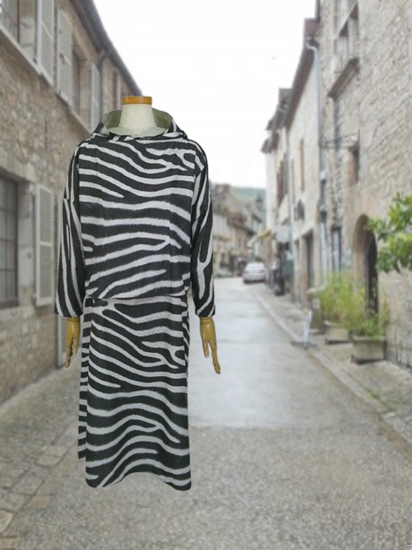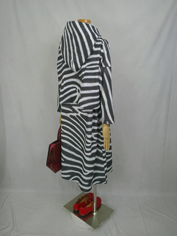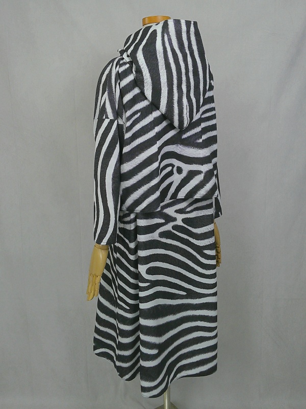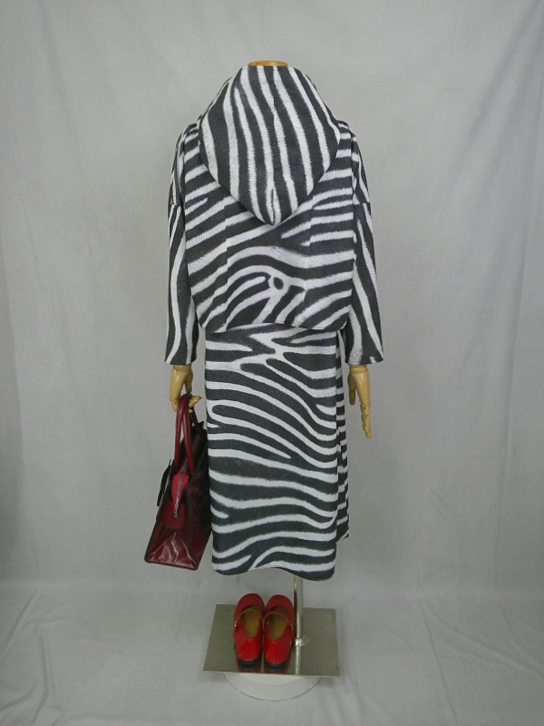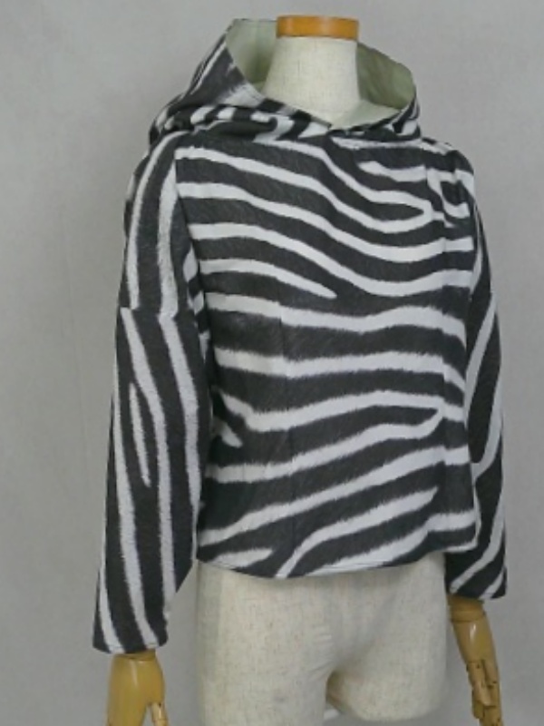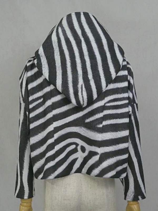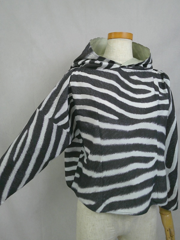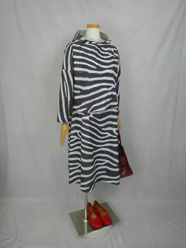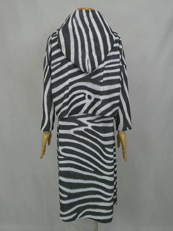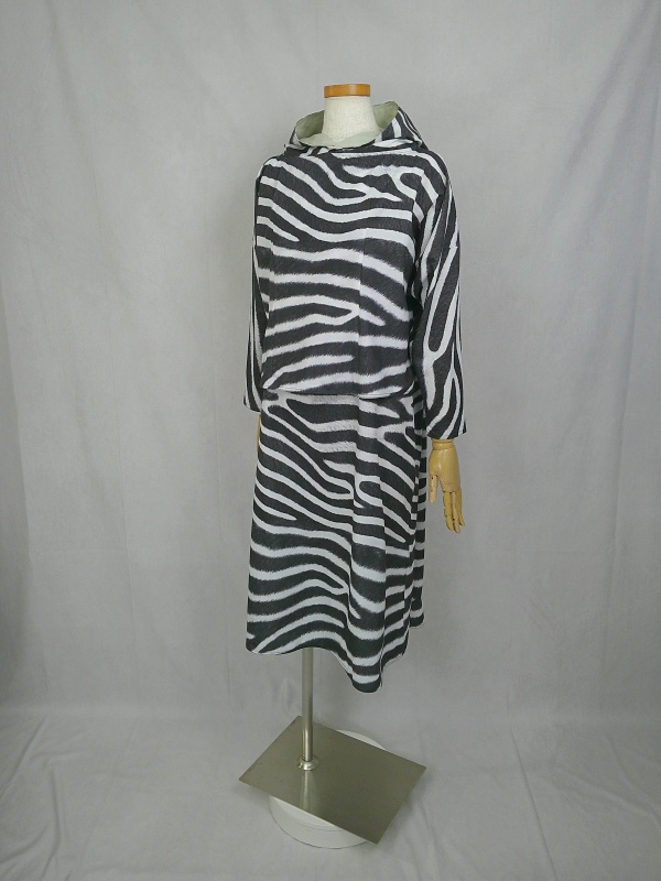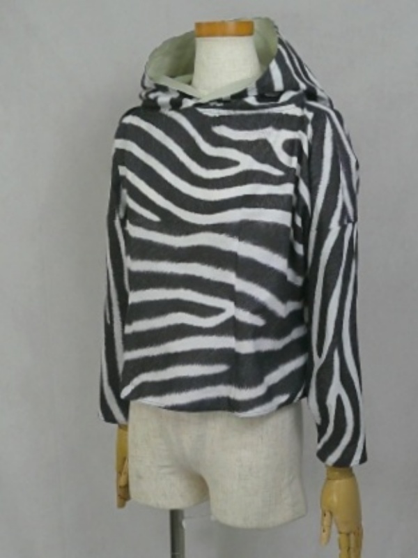 ゼブラ柄のショート丈フードブラウスは、胸の位置から入れたタックが生み出すキレイなシルエットや、内側に無地生地を用いたいろいろな表情を見せるフード、ドロップショルダー&すっきりとした袖口のデザインなどがオシャレに見せ、控えめに広がるAラインのミディ丈インナーワンピースとの組み合わせは、より高級感のあるエレガントな雰囲気を演出しています。