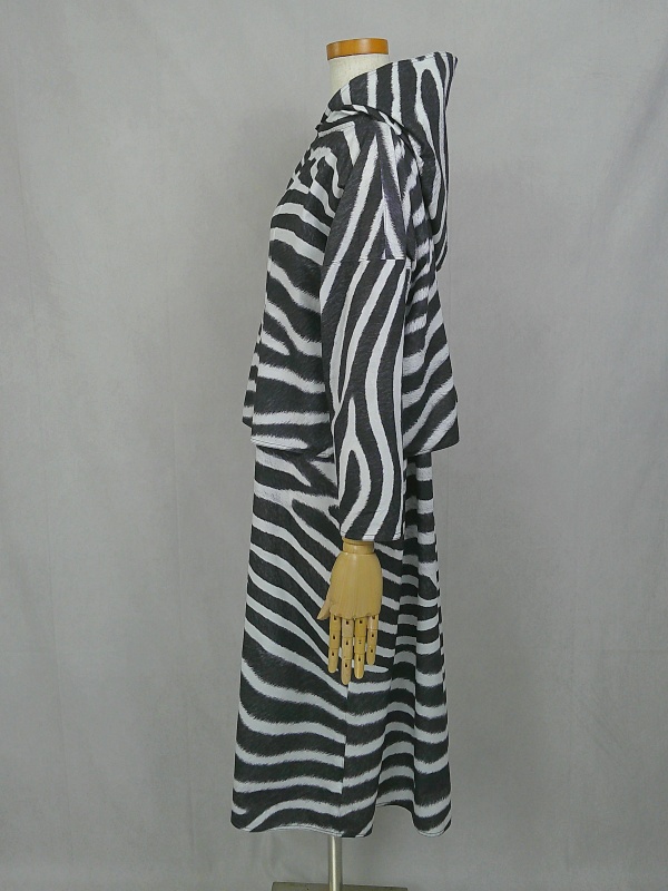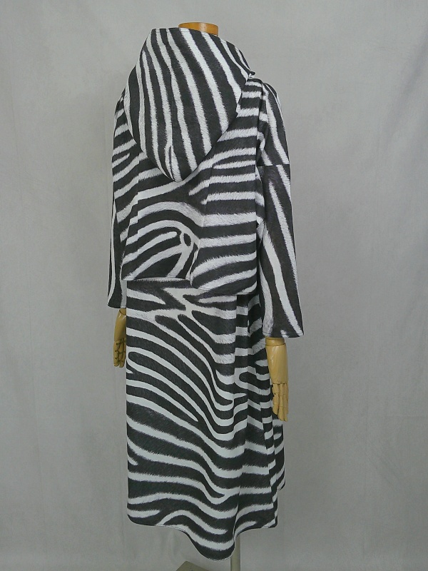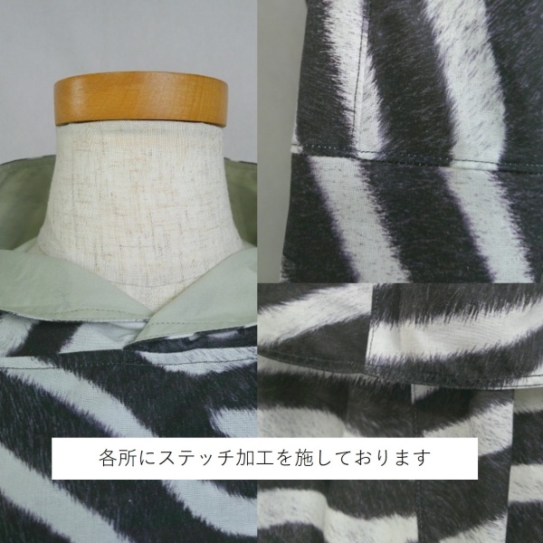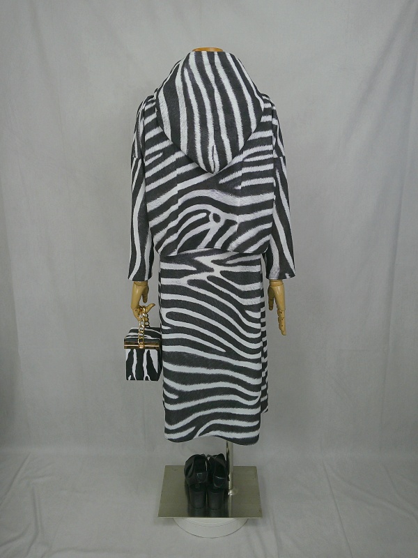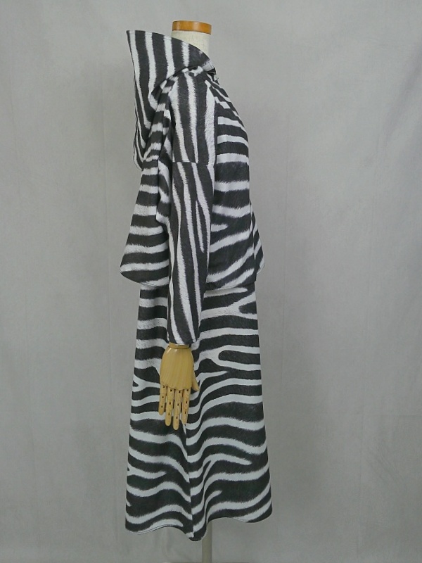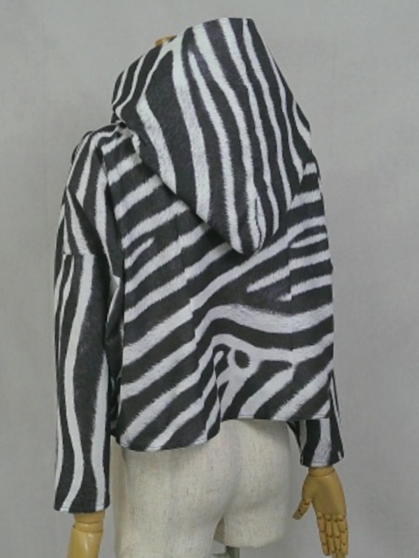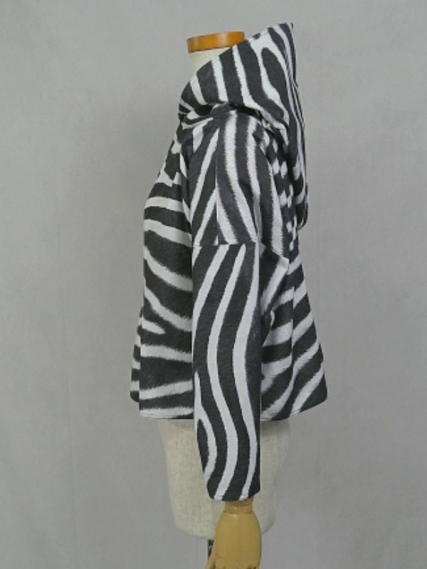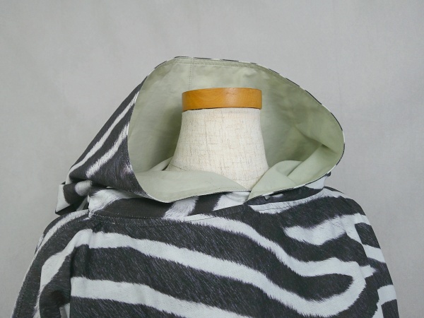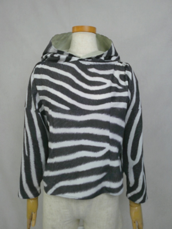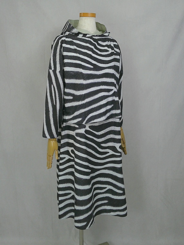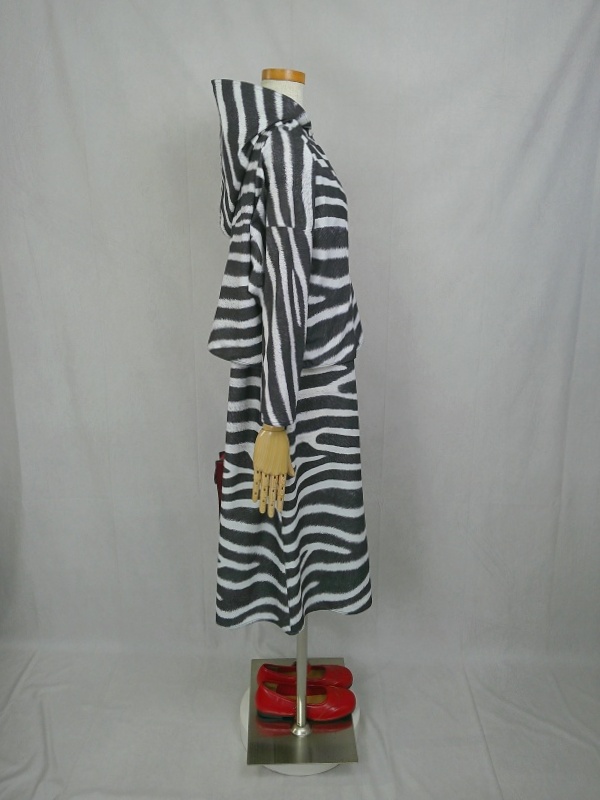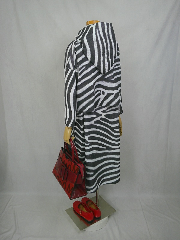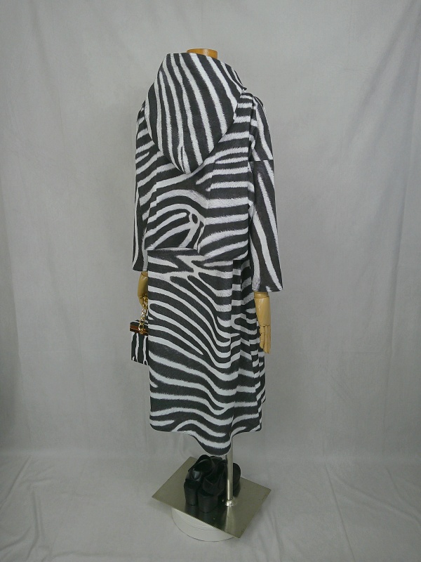 ゼブラ柄のショート丈フードブラウスは、胸の位置から入れたタックが生み出すキレイなシルエットや、内側に無地生地を用いたいろいろな表情を見せるフード、ドロップショルダー&すっきりとした袖口のデザインなどがオシャレに見せ、控えめに広がるAラインのミディ丈インナーワンピースとの組み合わせは、より高級感のあるエレガントな雰囲気を演出しています。