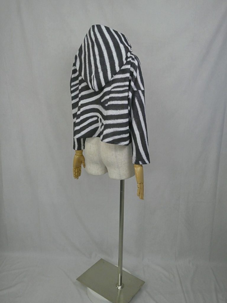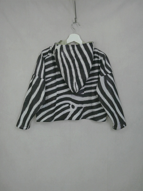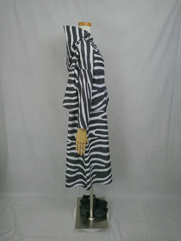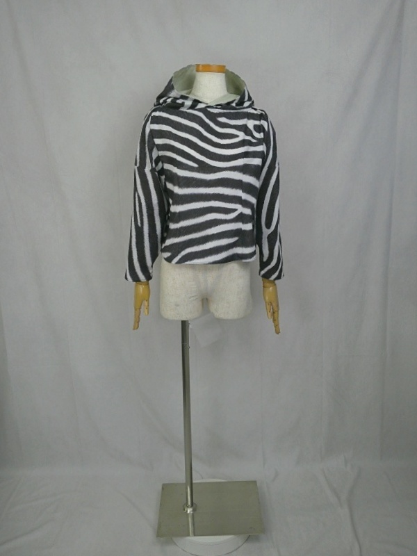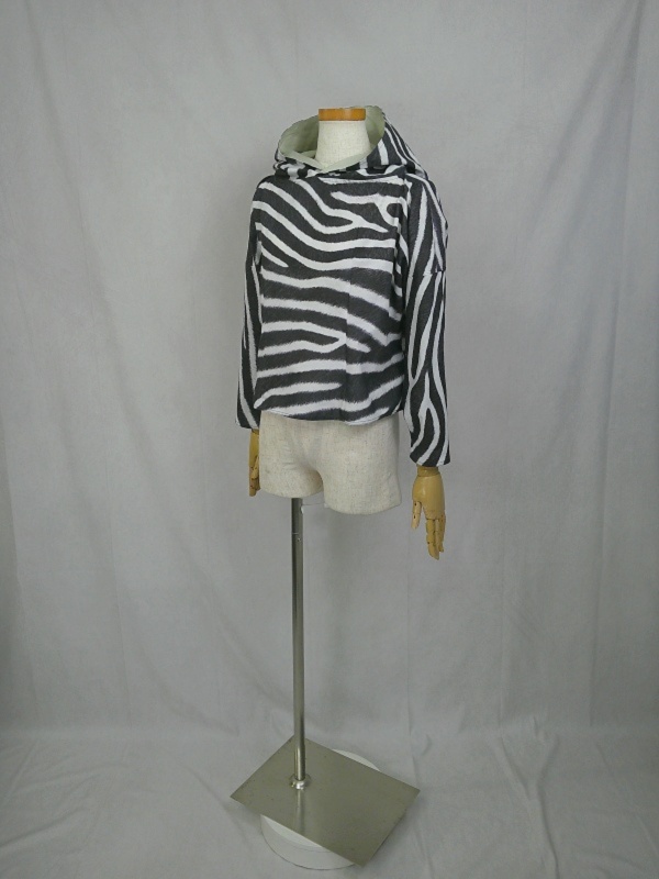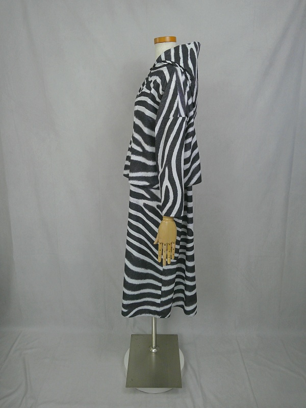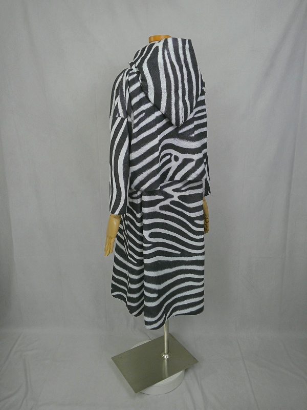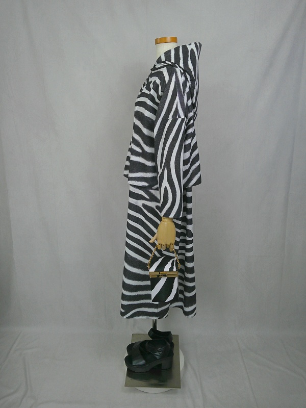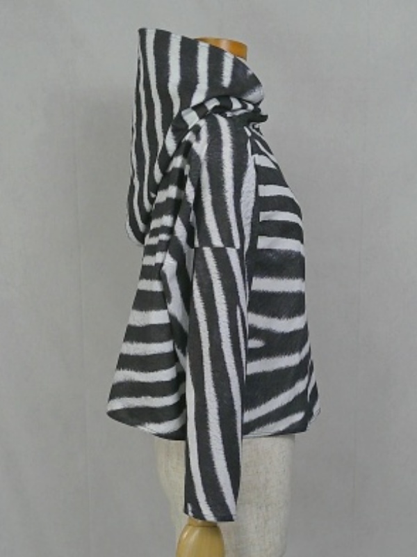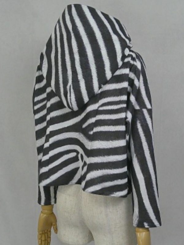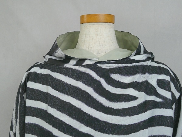 ゼブラ柄のショート丈フードブラウスは、胸の位置から入れたタックが生み出すキレイなシルエットや、内側に無地生地を用いたいろいろな表情を見せるフード、ドロップショルダー&すっきりとした袖口のデザインなどがオシャレに見せ、控えめに広がるAラインのミディ丈インナーワンピースとの組み合わせは、より高級感のあるエレガントな雰囲気を演出しています。