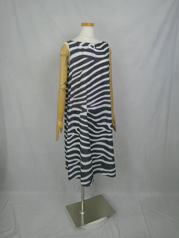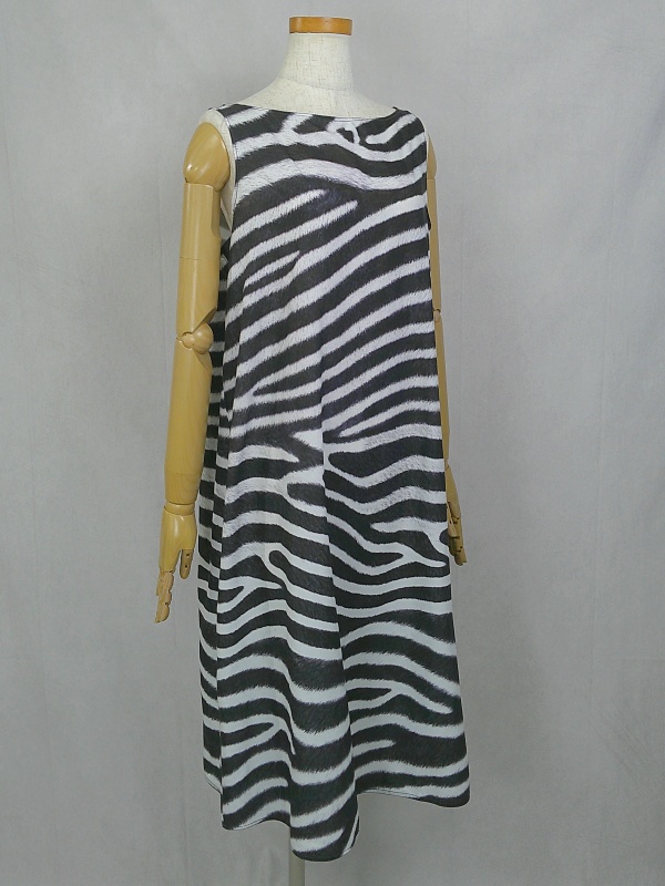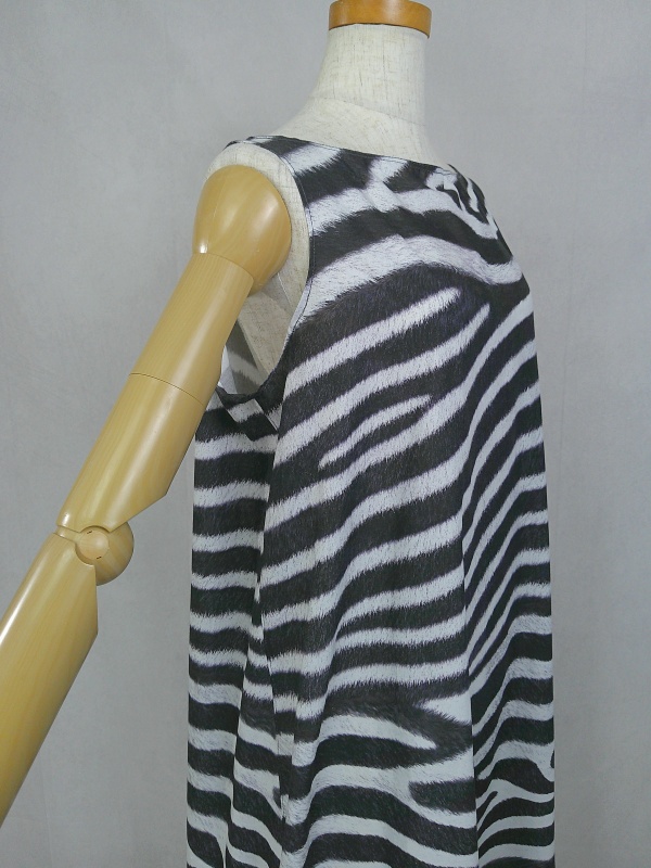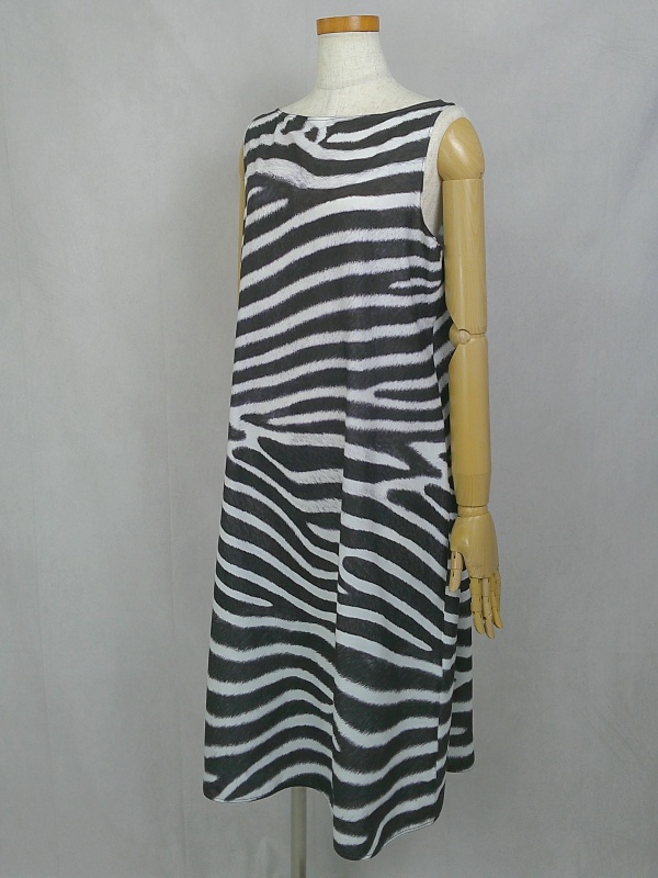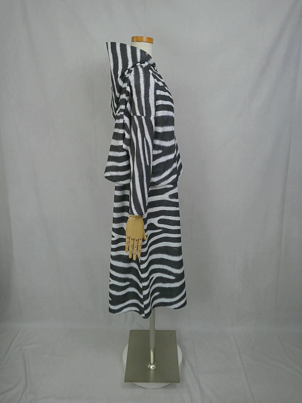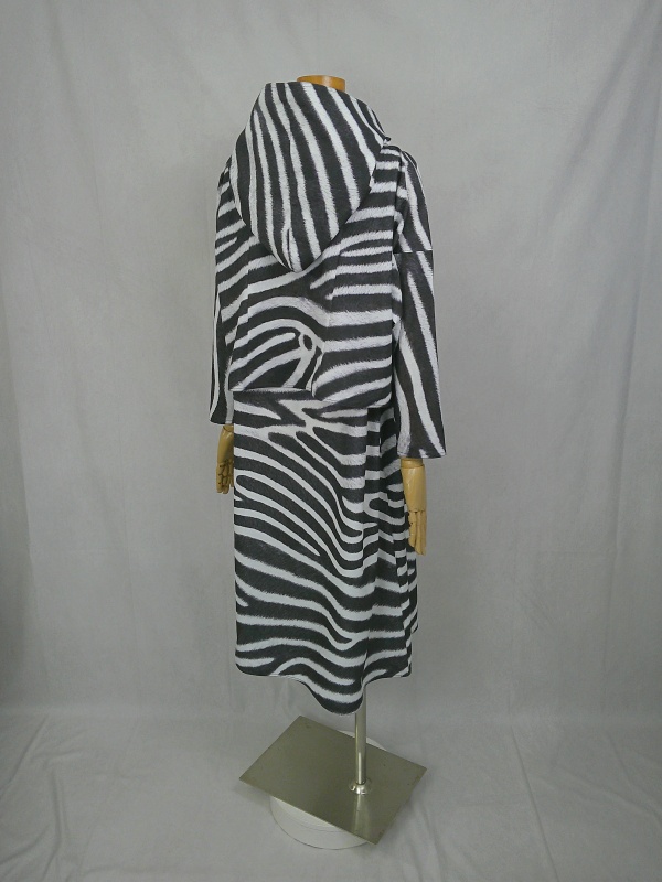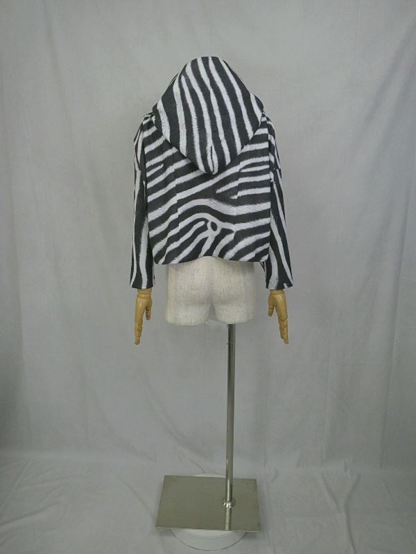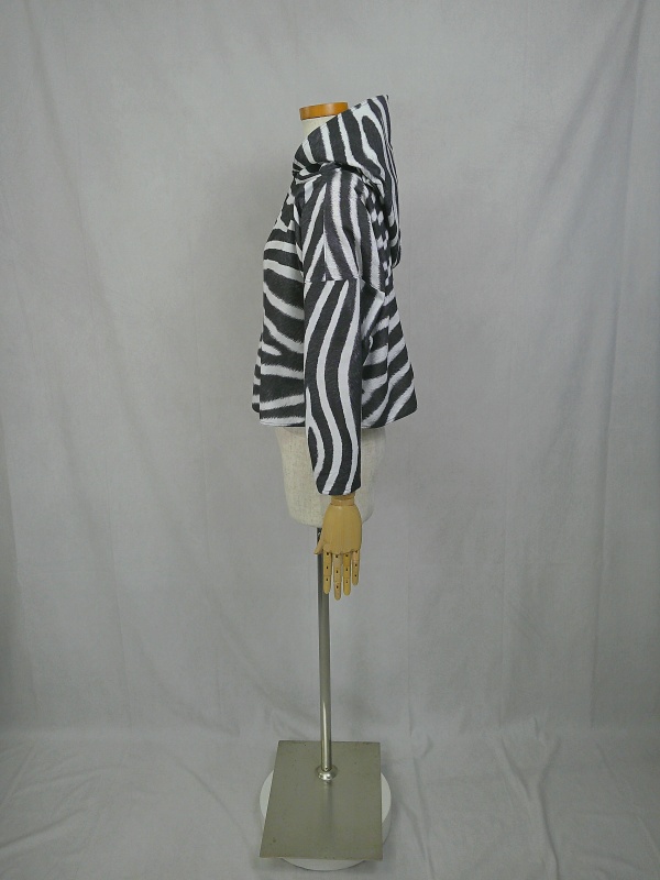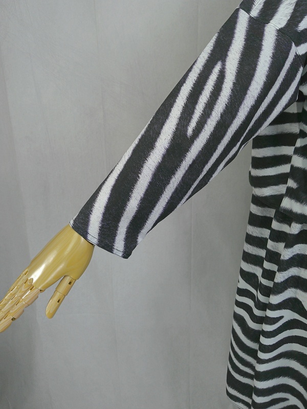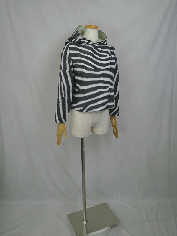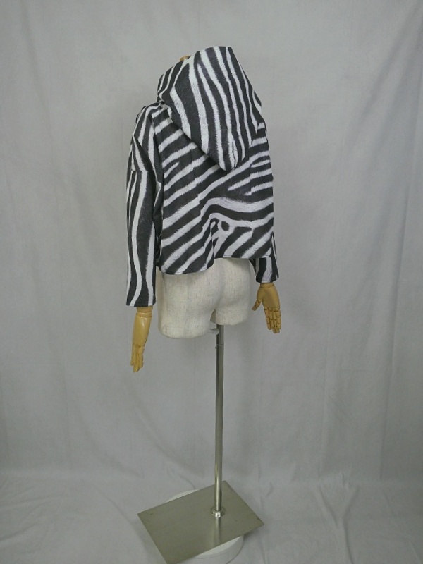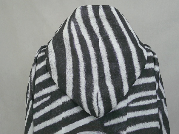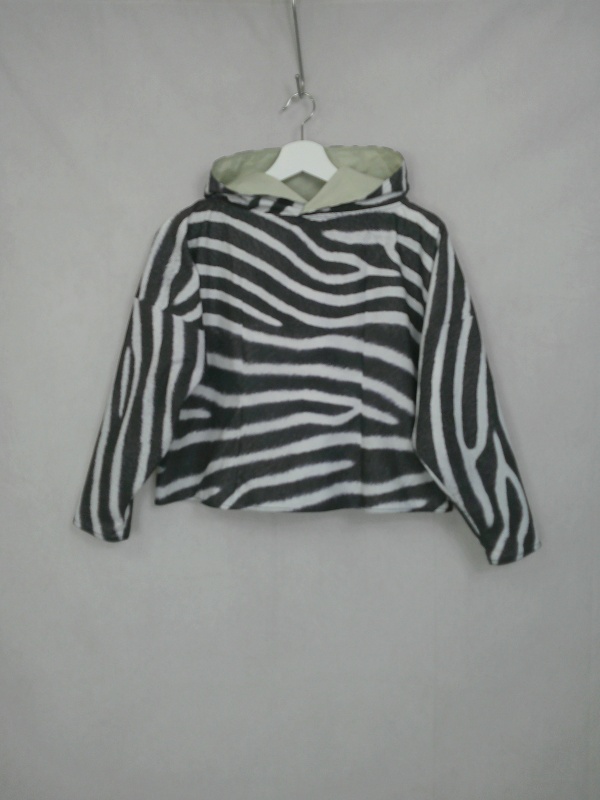 ゼブラ柄のショート丈フードブラウスは、胸の位置から入れたタックが生み出すキレイなシルエットや、内側に無地生地を用いたいろいろな表情を見せるフード、ドロップショルダー&すっきりとした袖口のデザインなどがオシャレに見せ、控えめに広がるAラインのミディ丈インナーワンピースとの組み合わせは、より高級感のあるエレガントな雰囲気を演出しています。