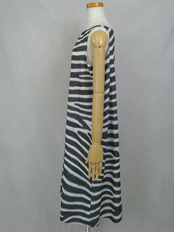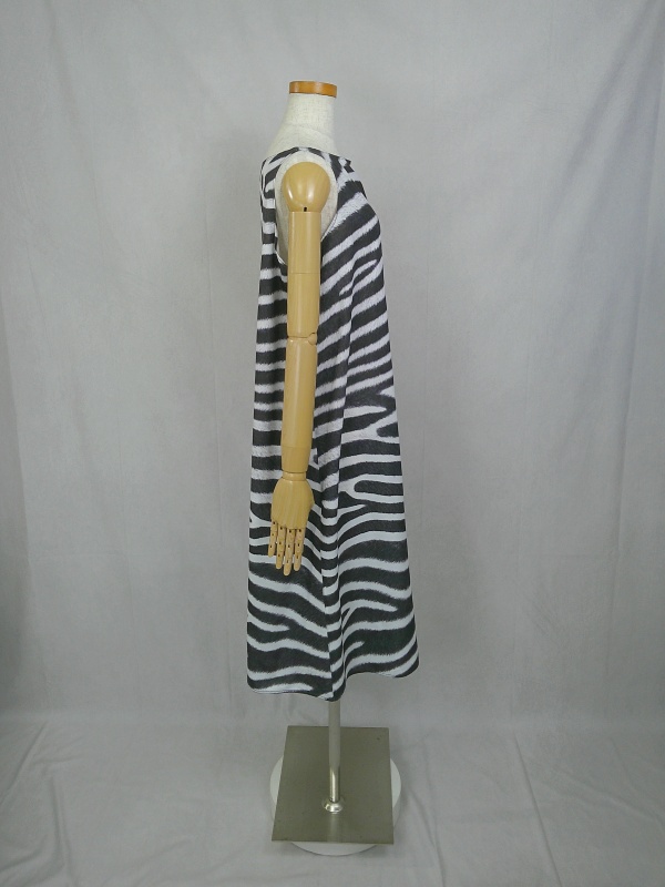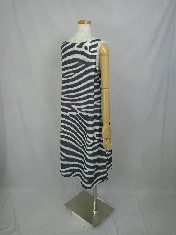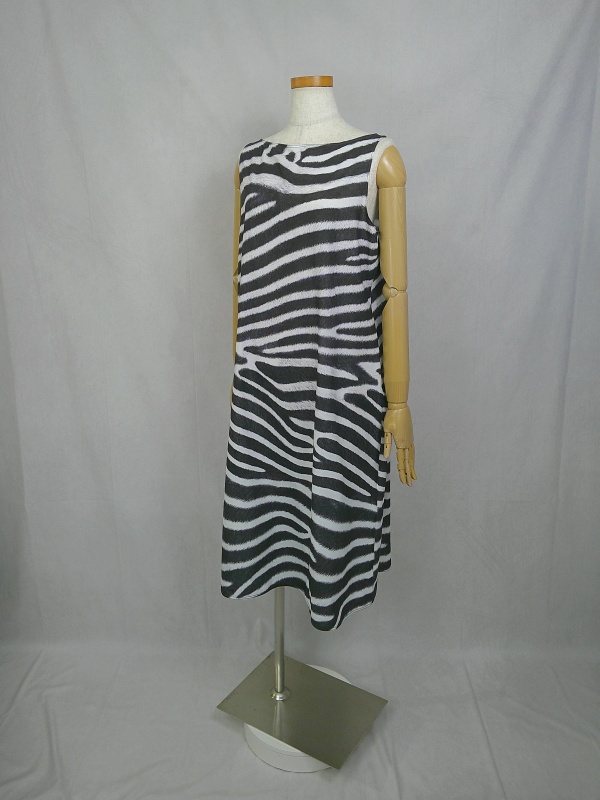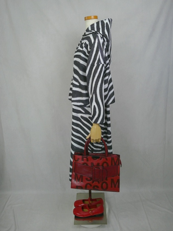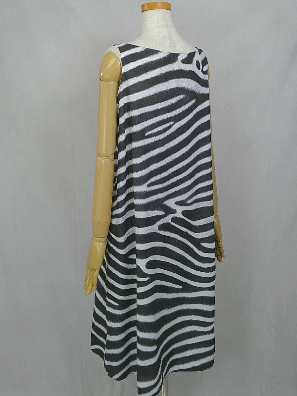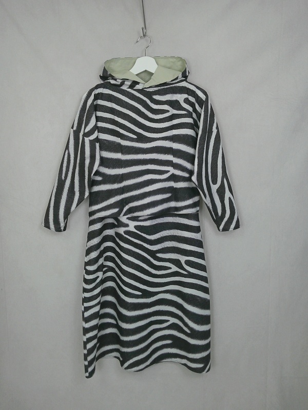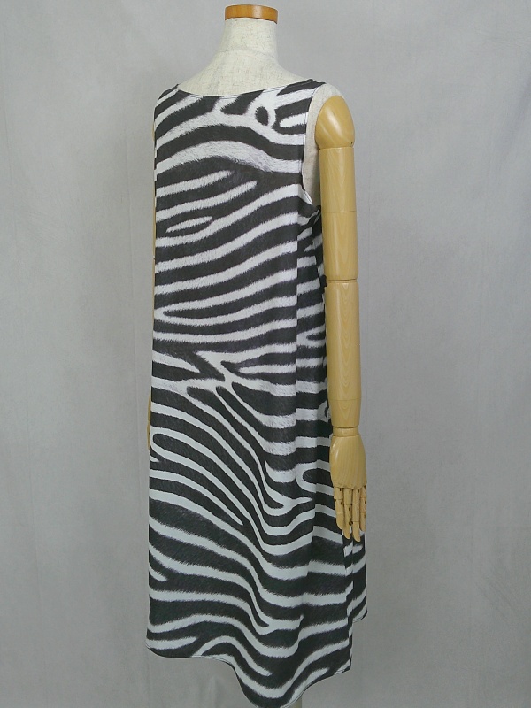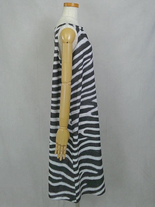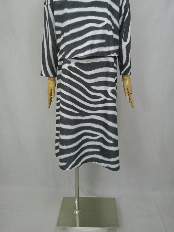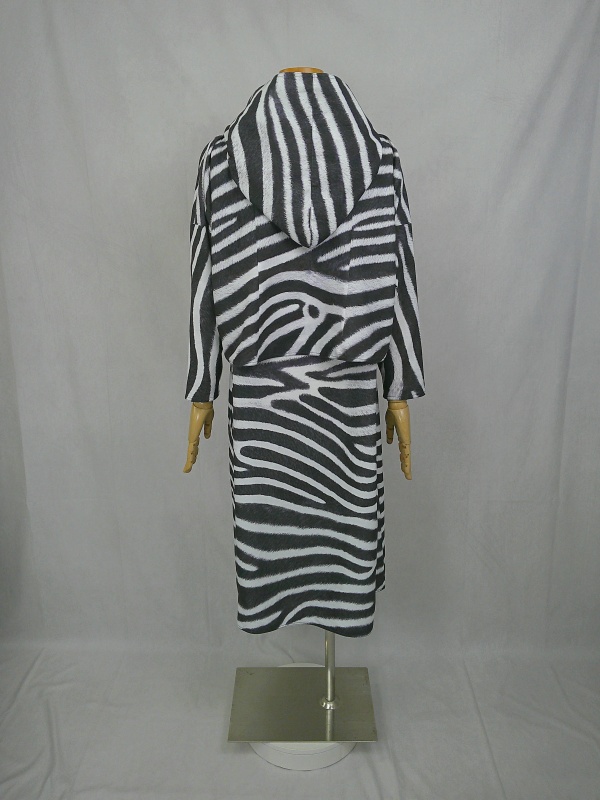 ゼブラ柄のショート丈フードブラウスは、胸の位置から入れたタックが生み出すキレイなシルエットや、内側に無地生地を用いたいろいろな表情を見せるフード、ドロップショルダー&すっきりとした袖口のデザインなどがオシャレに見せ、控えめに広がるAラインのミディ丈インナーワンピースとの組み合わせは、より高級感のあるエレガントな雰囲気を演出しています。