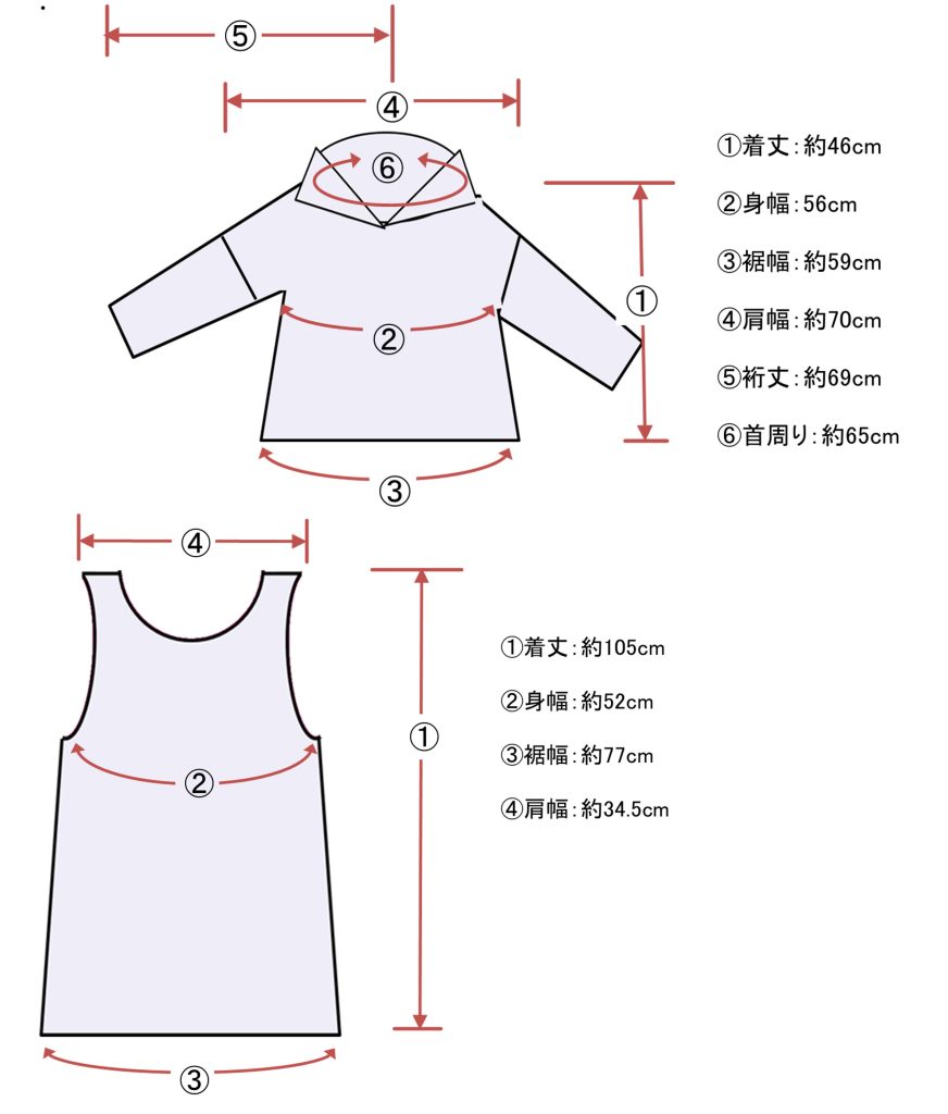 着丈:約46cm 身幅:約56cm 裾幅:約59cm 肩幅:約70cm 裄丈:約69cm 首周り:約65cm
