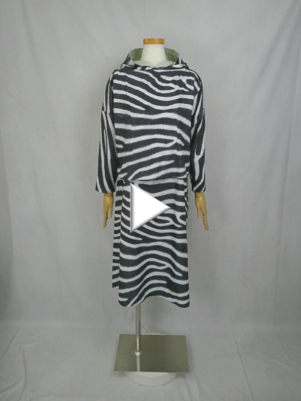 ゼブラ柄のショート丈フードブラウスは、胸の位置から入れたタックが生み出すキレイなシルエットや、内側に無地生地を用いたいろいろな表情を見せるフード、ドロップショルダー&すっきりとした袖口のデザインなどがオシャレに見せ、控えめに広がるAラインのミディ丈インナーワンピースとの組み合わせは、より高級感のあるエレガントな雰囲気を演出しています。