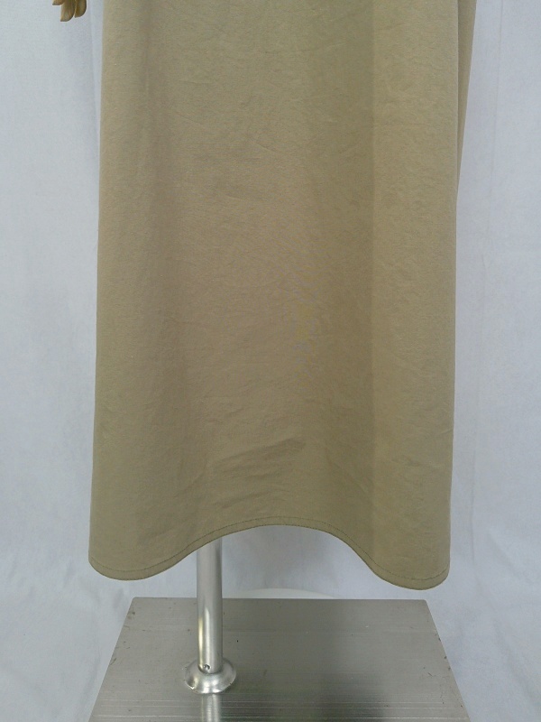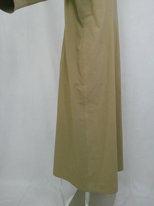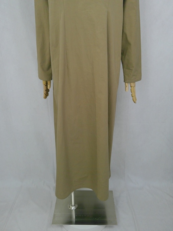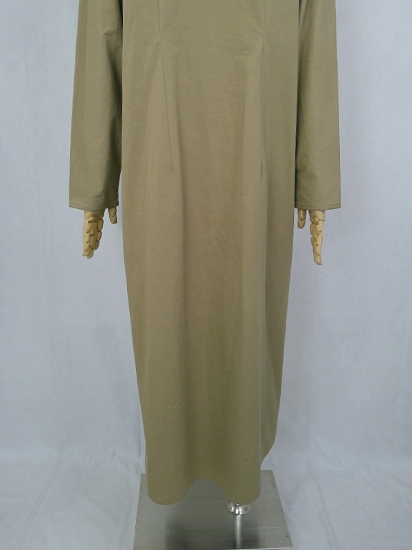 すっきり広がるAラインのロング丈ワンピースは、胸の部分に施した2か所のタックが絶妙なシルエットを生み出し、近江産のハリのある素材に、カーキベージュ色の落ち着いた色合いが、上品でオシャレな雰囲気を演出しています。