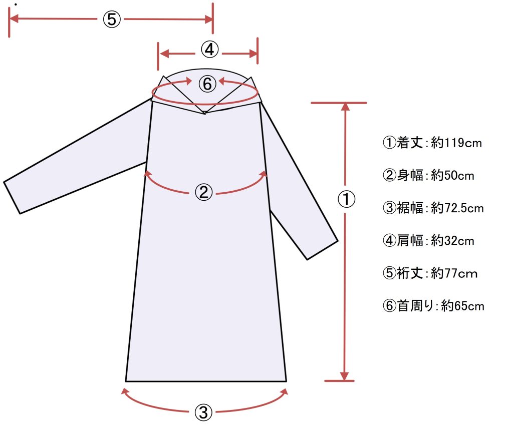 着丈:約119cm 身幅:約50cm 裾幅:72.5cm 肩幅:約32cm 裄丈:約77cm 首周り:約65cm