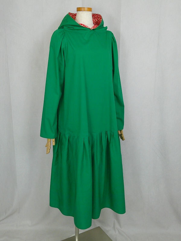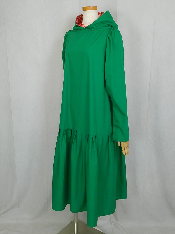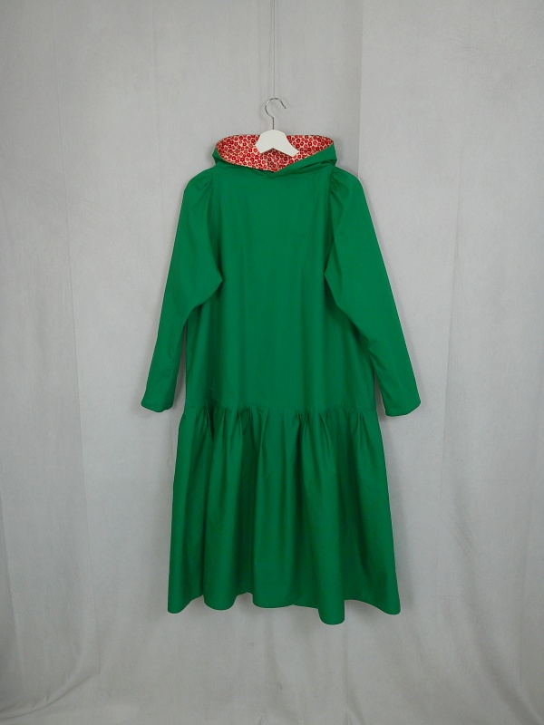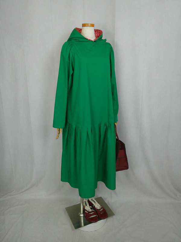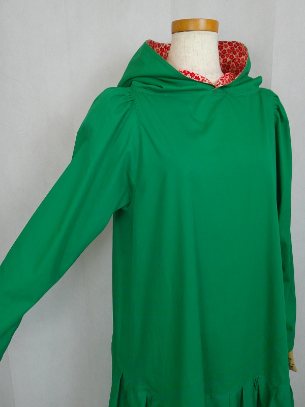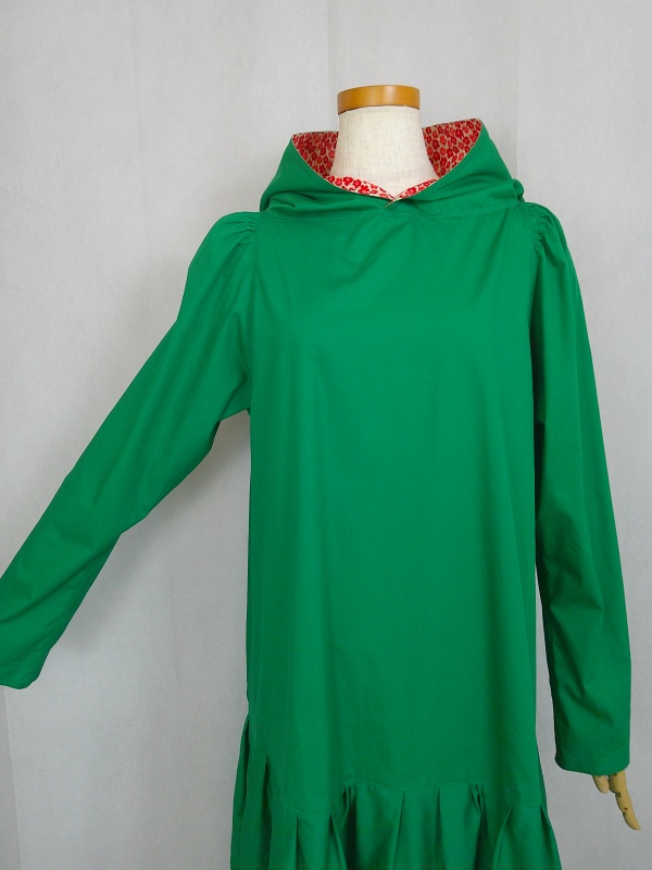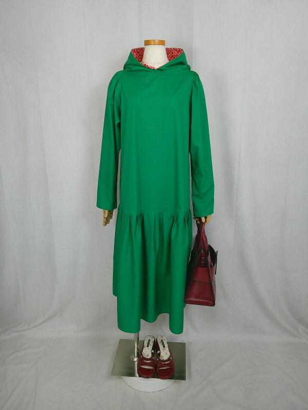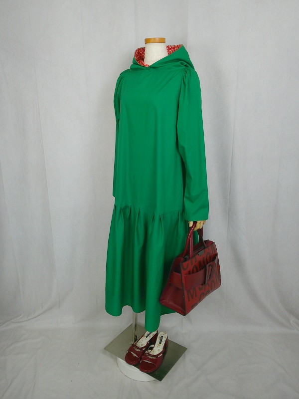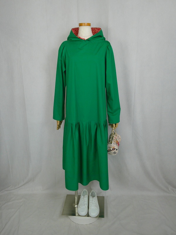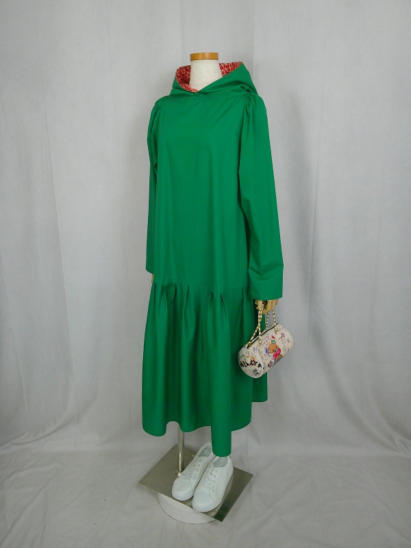 ローウエストの切替部分からたっぷり寄せたギャザーのふんわり感や、緑一色のすっきりとした色合いのミモレ丈ワンピースは、フードの内側に用いた赤色の小花柄が、大人のかわいらしさを演出しています。