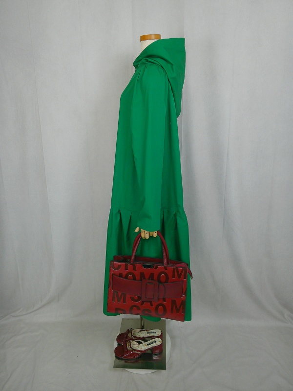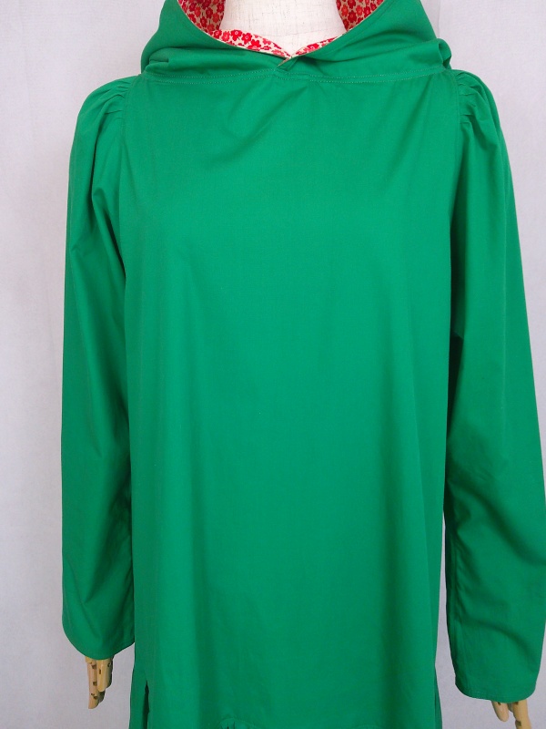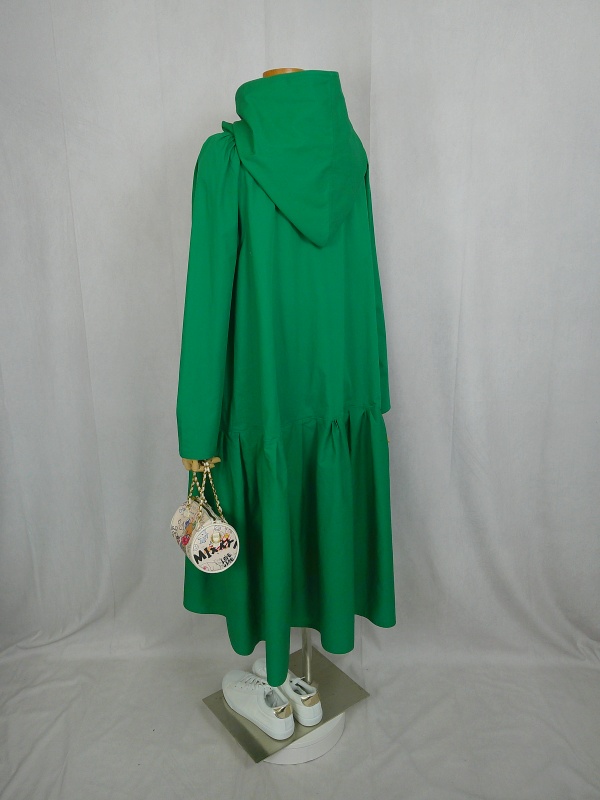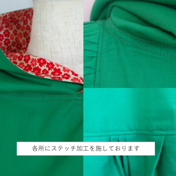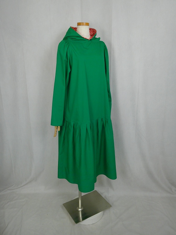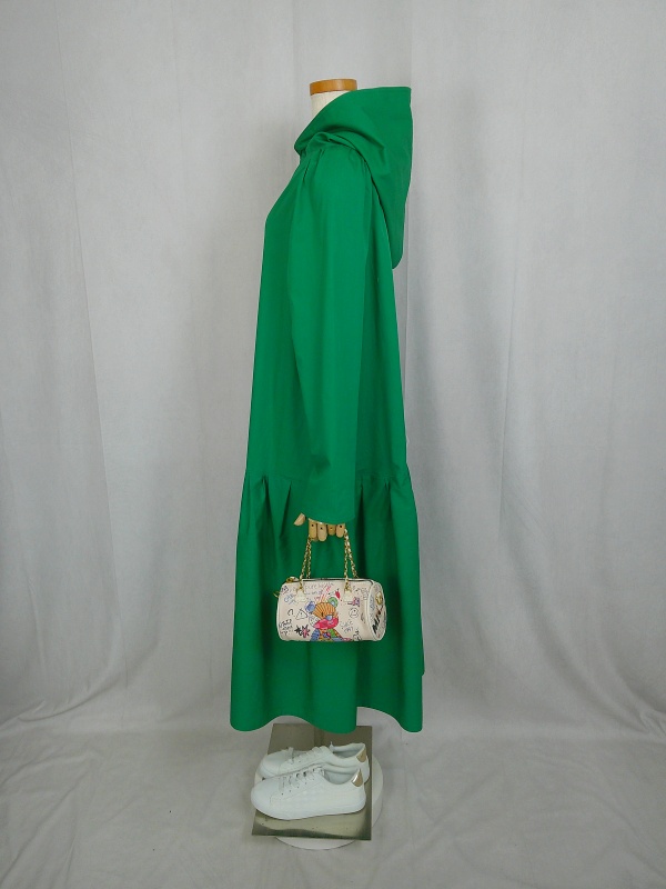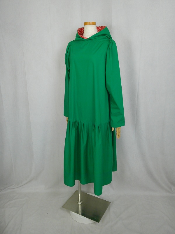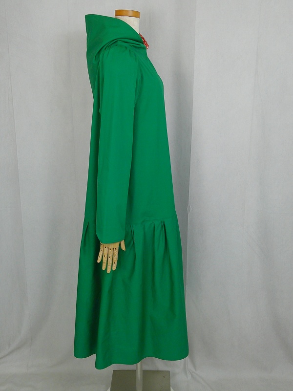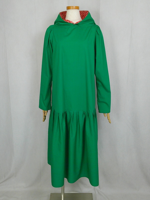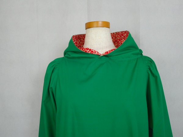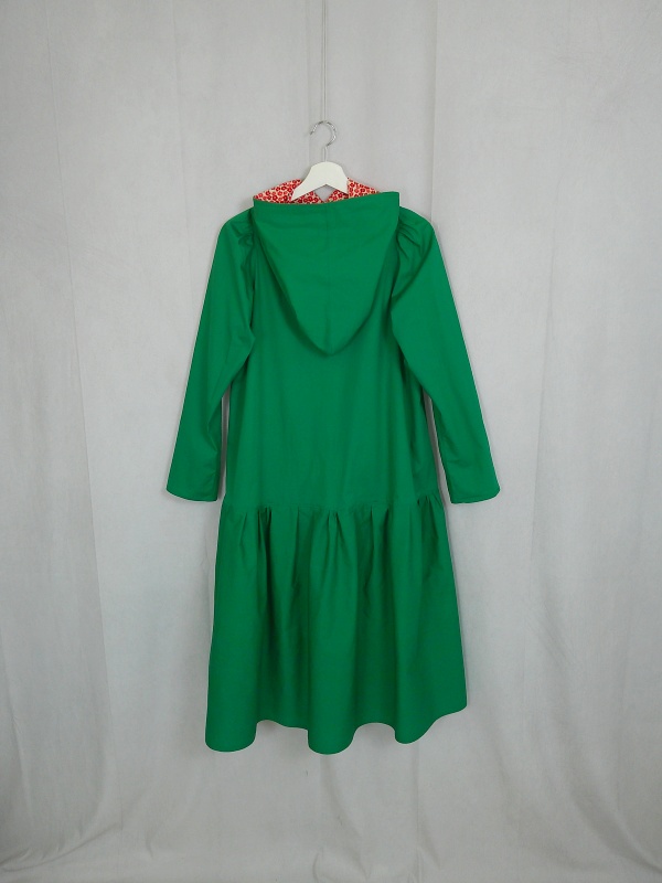 ローウエストの切替部分からたっぷり寄せたギャザーのふんわり感や、緑一色のすっきりとした色合いのミモレ丈ワンピースは、フードの内側に用いた赤色の小花柄が、大人のかわいらしさを演出しています。