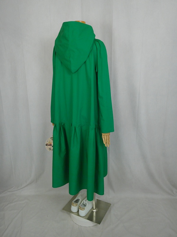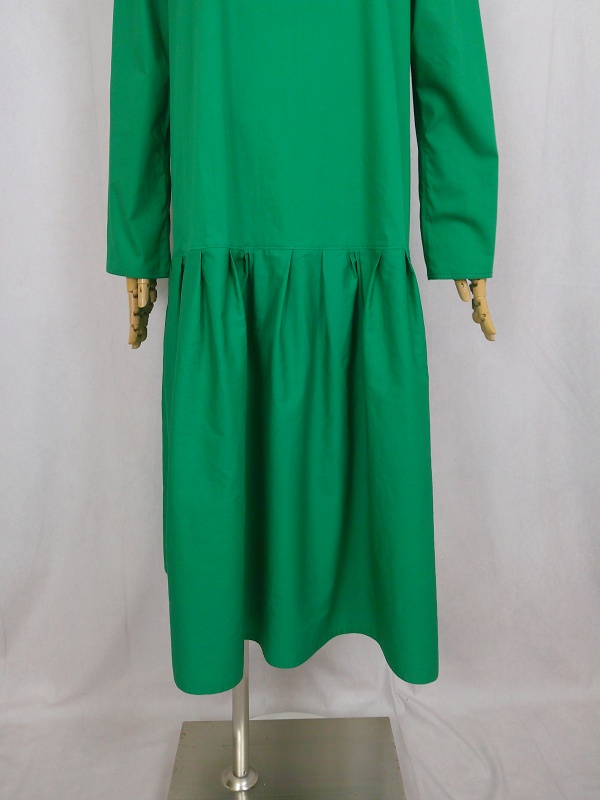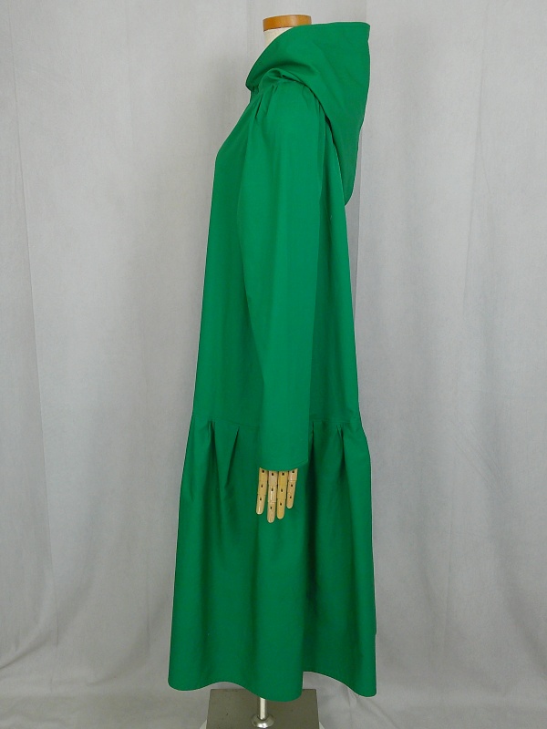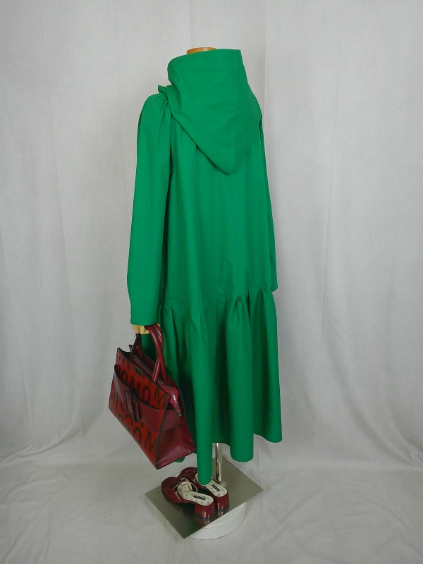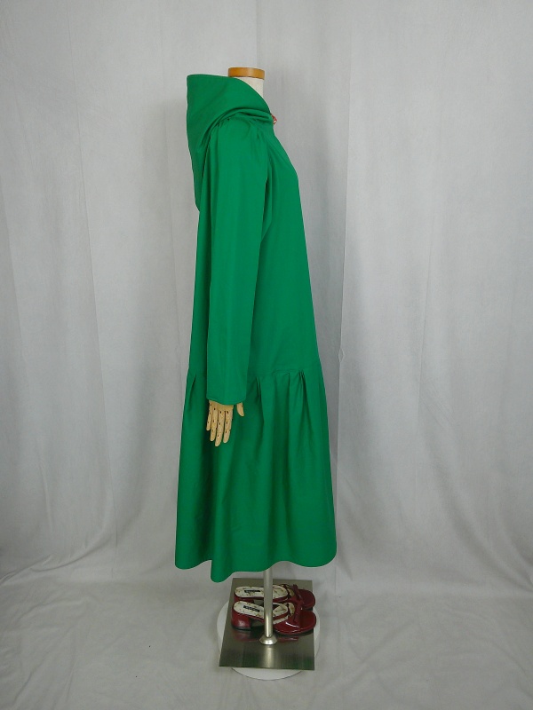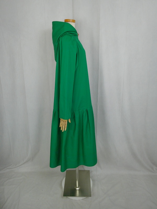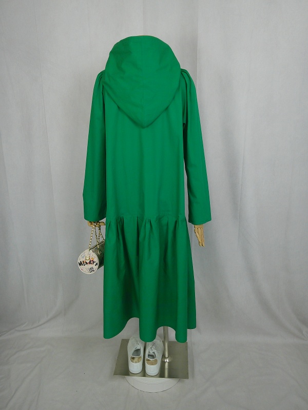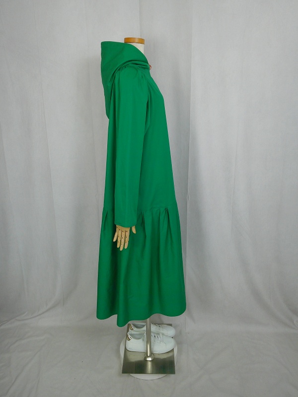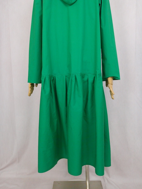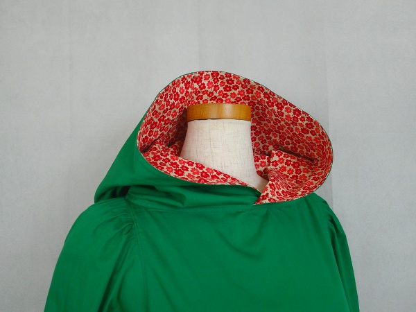 ローウエストの切替部分からたっぷり寄せたギャザーのふんわり感や、緑一色のすっきりとした色合いのミモレ丈ワンピースは、フードの内側に用いた赤色の小花柄が、大人のかわいらしさを演出しています。