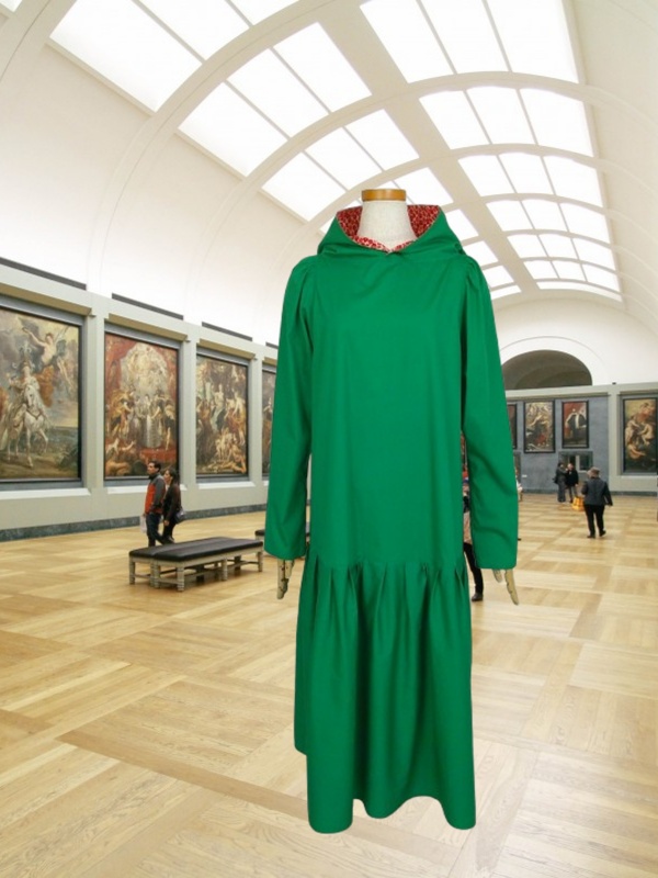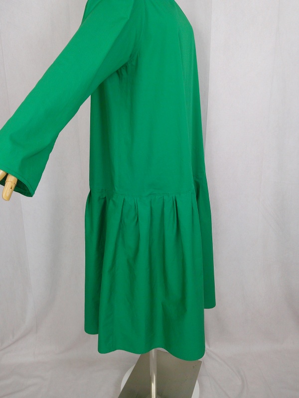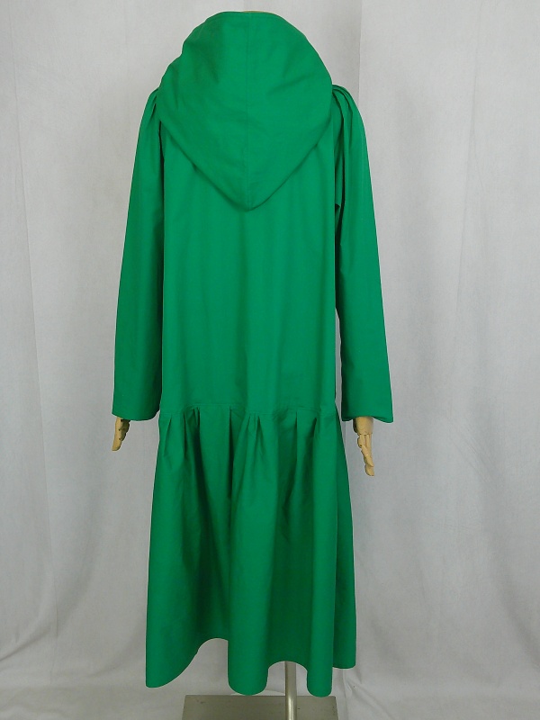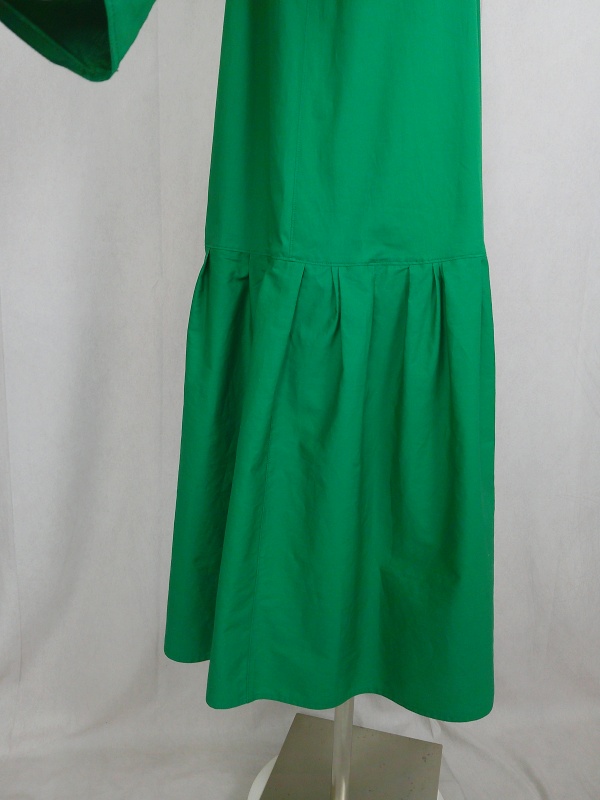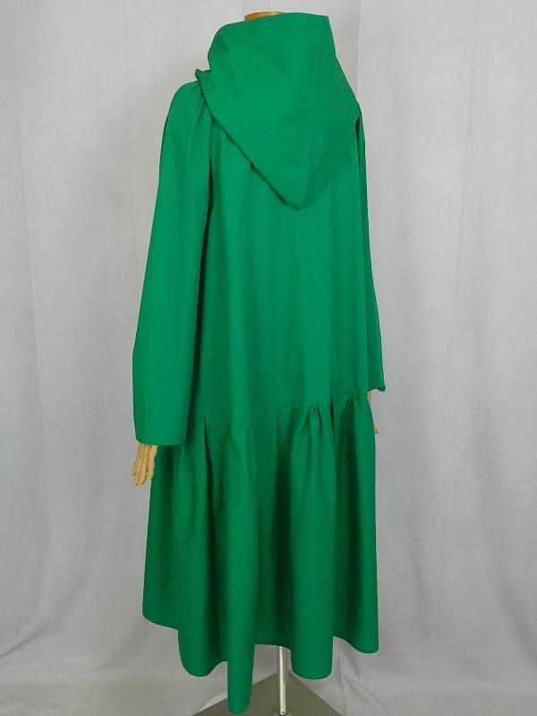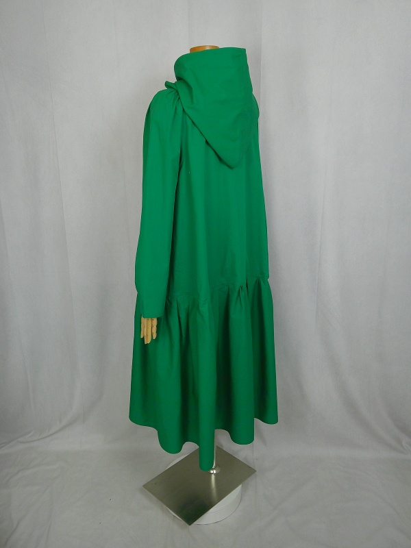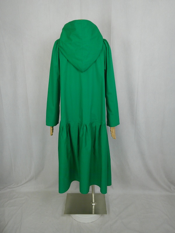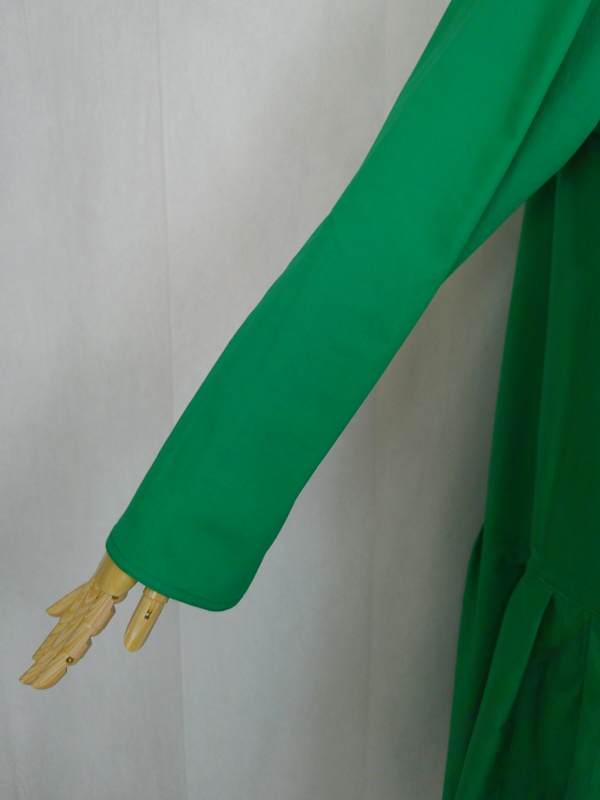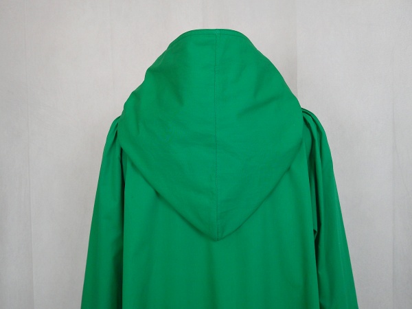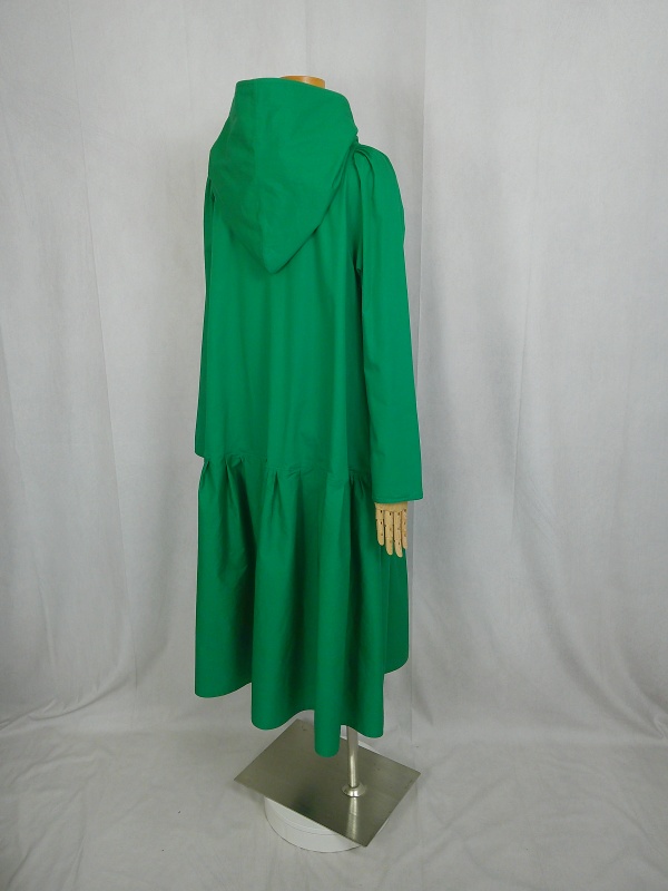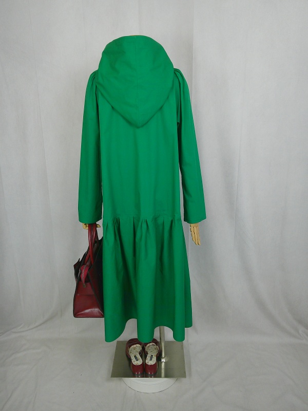 ローウエストの切替部分からたっぷり寄せたギャザーのふんわり感や、緑一色のすっきりとした色合いのミモレ丈ワンピースは、フードの内側に用いた赤色の小花柄が、大人のかわいらしさを演出しています。