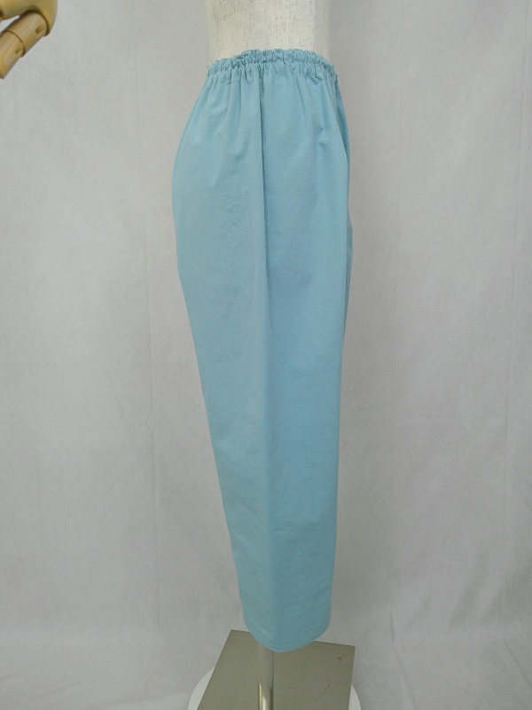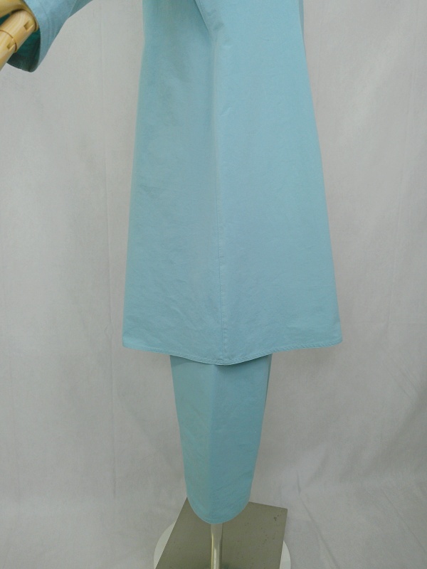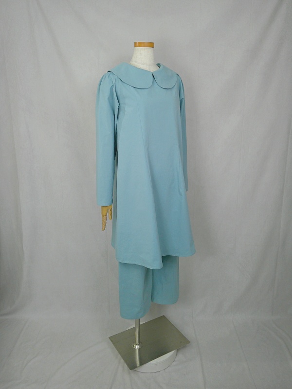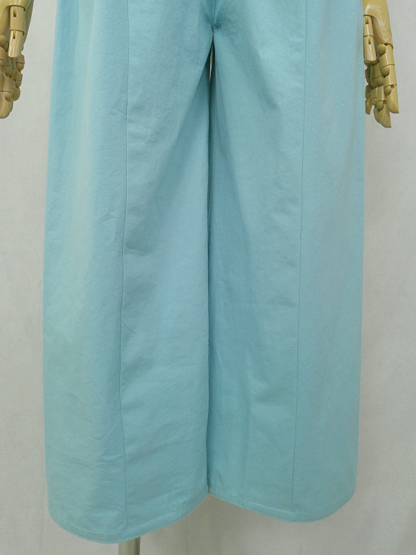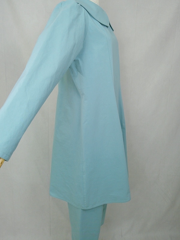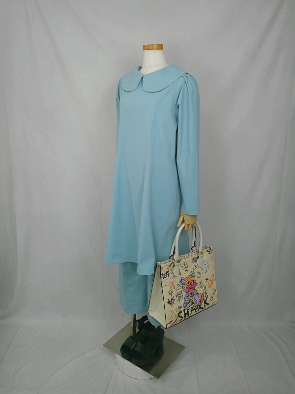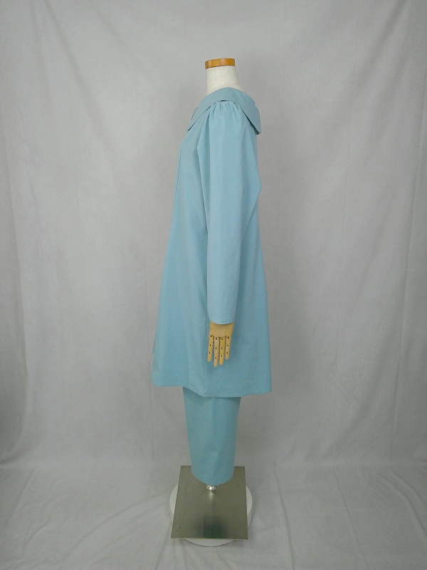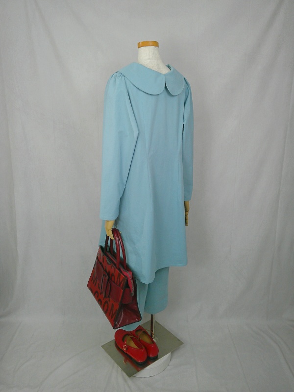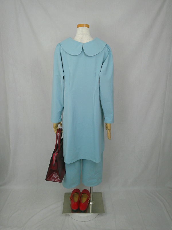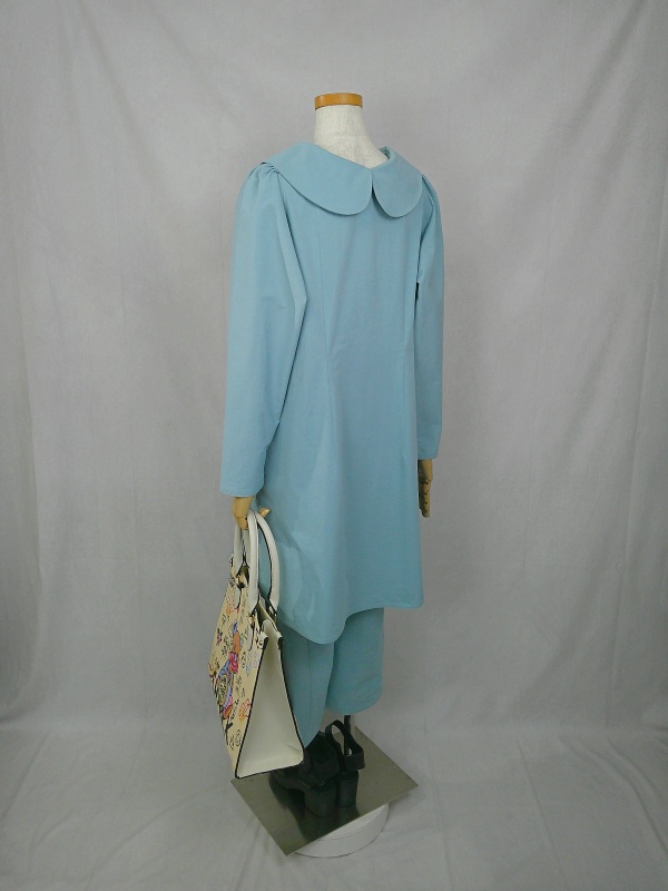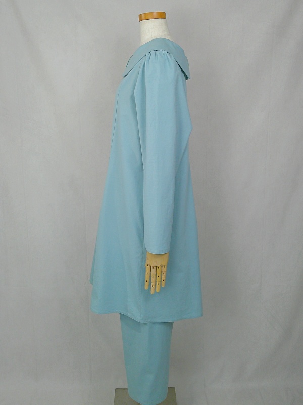 胸のプリンセスラインのデザインが、キレイなシルエットを描くミディ丈のワンピースと、絞りを入れたミモレ丈のパンツの組み合わせは、ハリと伸縮性のあるウェザークロスのライトブルーの色合いとともに、上品な大人の雰囲気を演出しています。