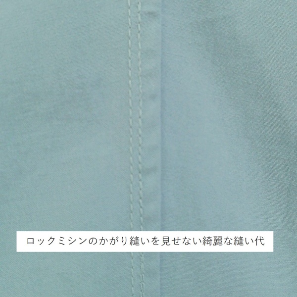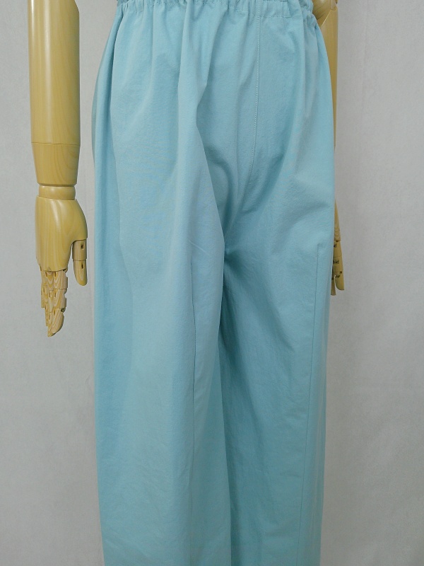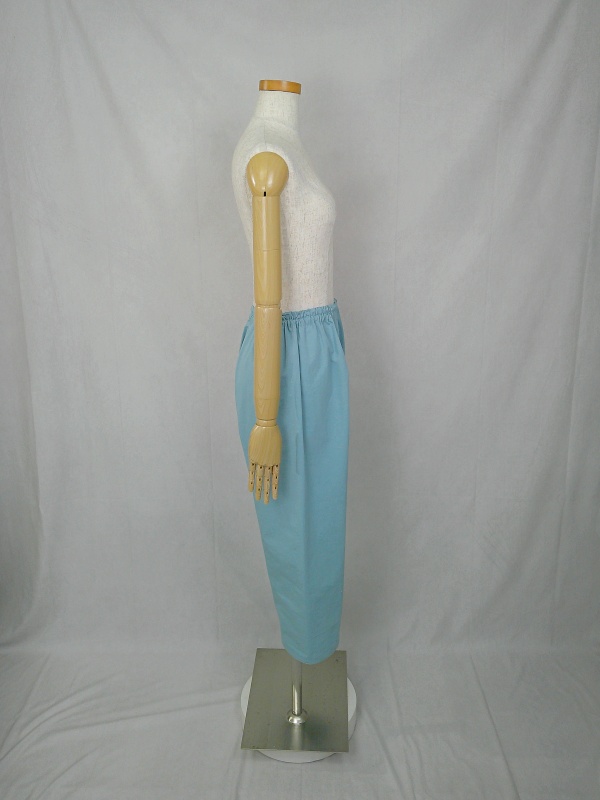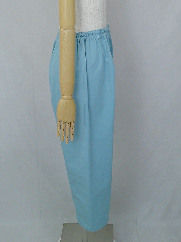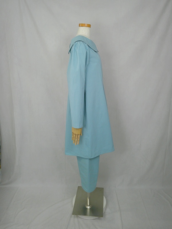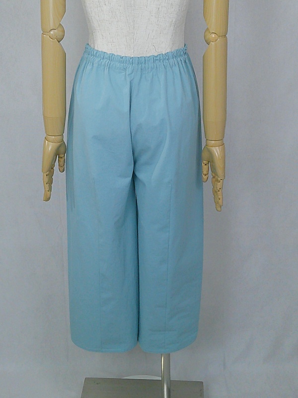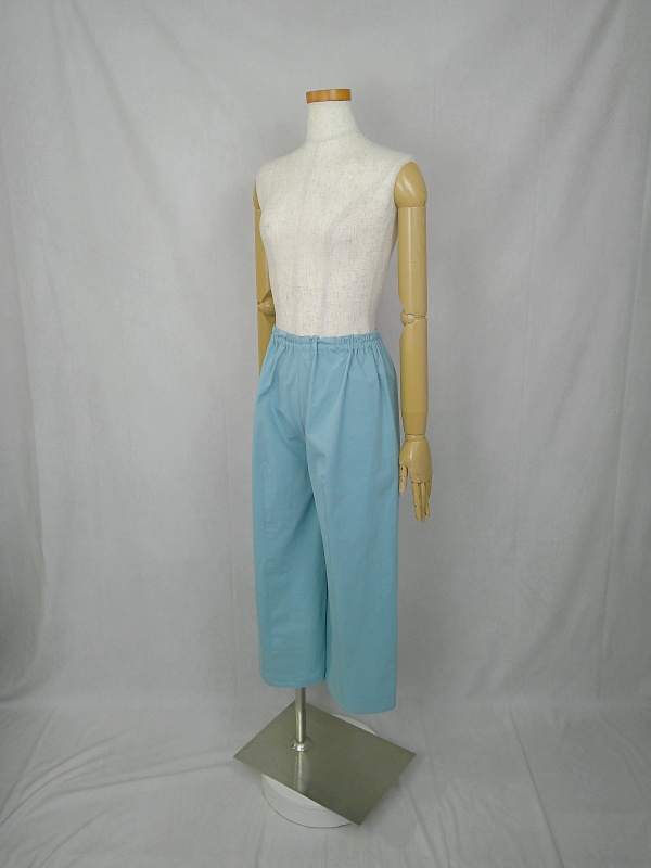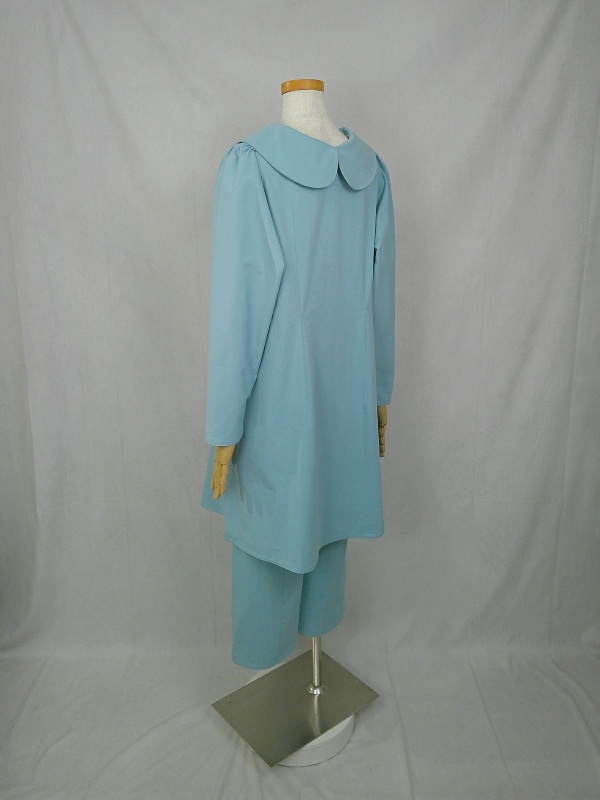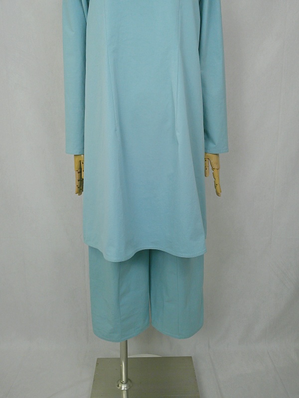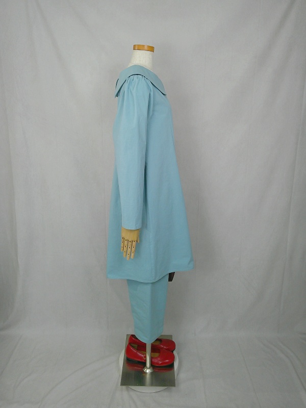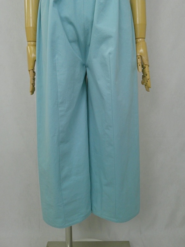 胸のプリンセスラインのデザインが、キレイなシルエットを描くミディ丈のワンピースと、絞りを入れたミモレ丈のパンツの組み合わせは、ハリと伸縮性のあるウェザークロスのライトブルーの色合いとともに、上品な大人の雰囲気を演出しています。