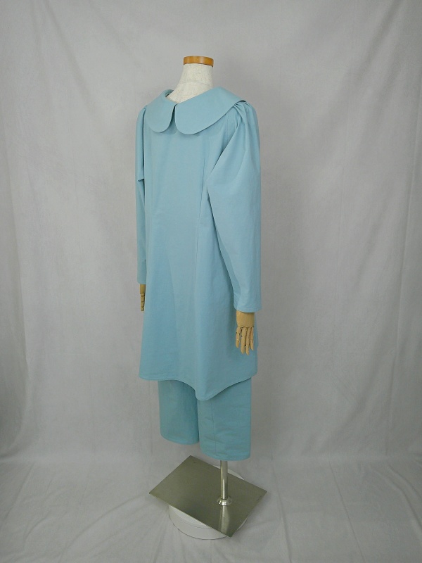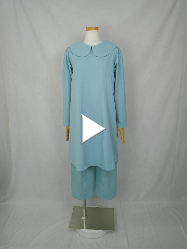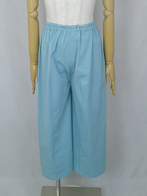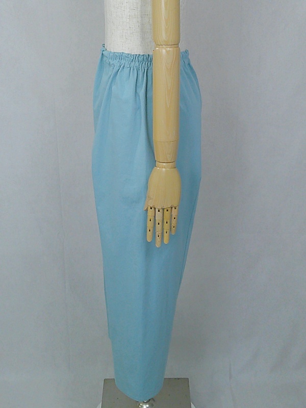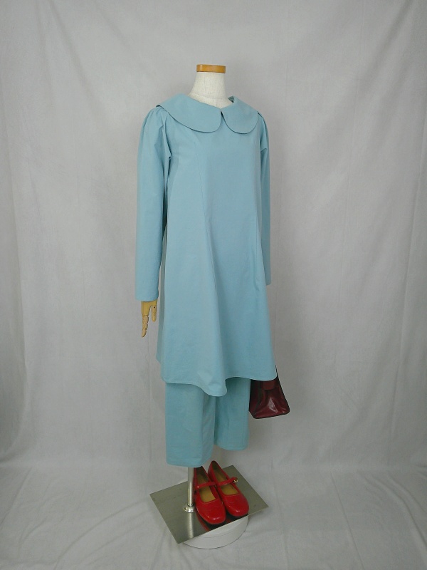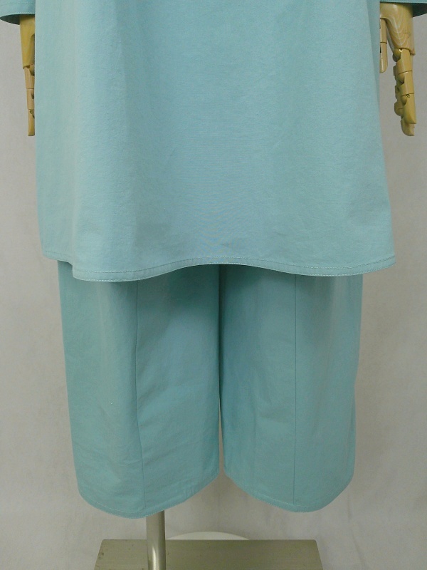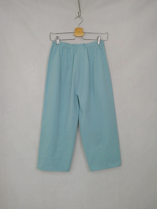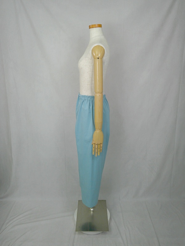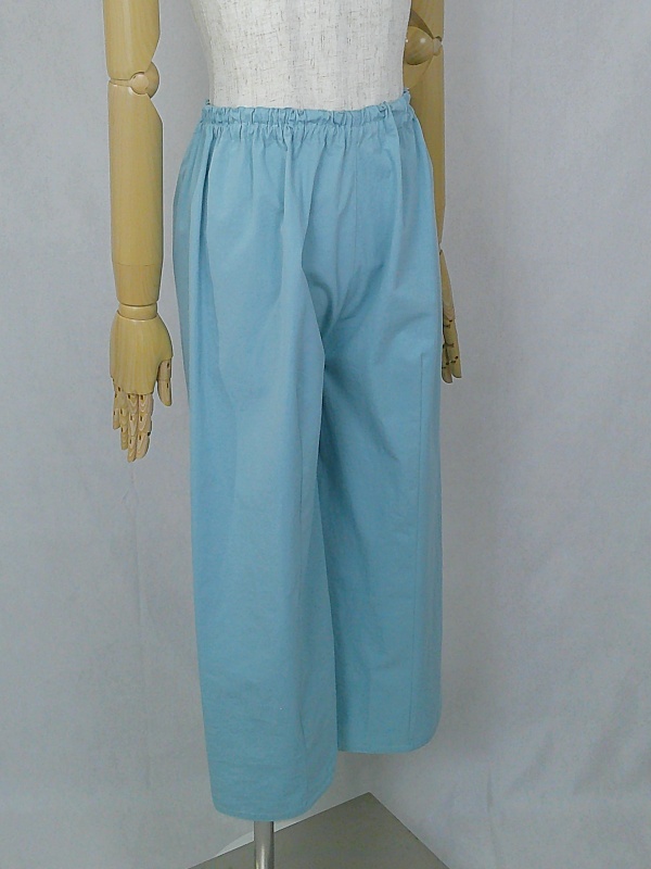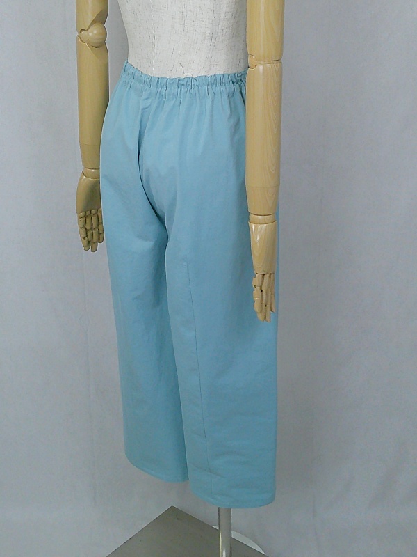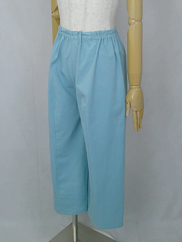 胸のプリンセスラインのデザインが、キレイなシルエットを描くミディ丈のワンピースと、絞りを入れたミモレ丈のパンツの組み合わせは、ハリと伸縮性のあるウェザークロスのライトブルーの色合いとともに、上品な大人の雰囲気を演出しています。
