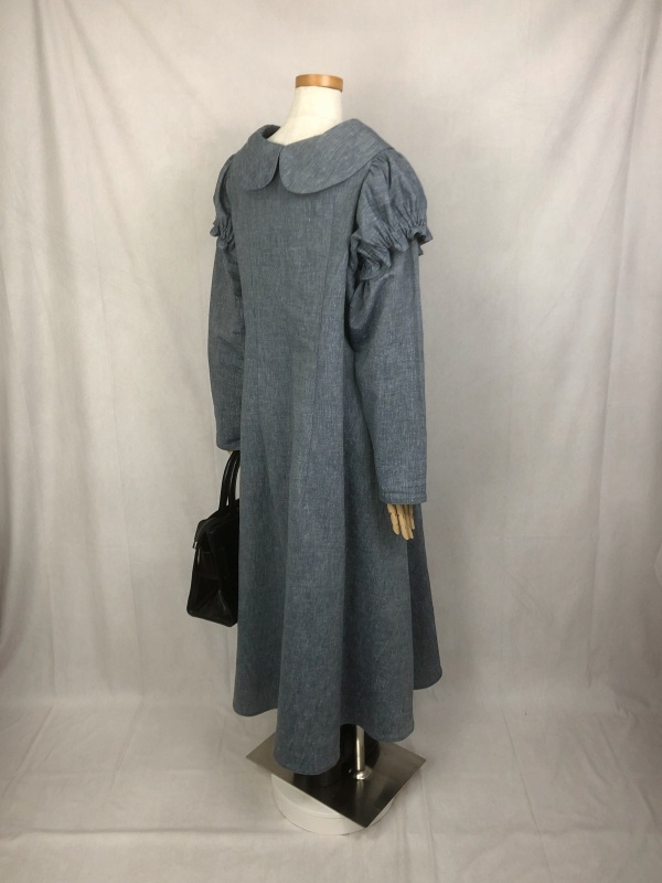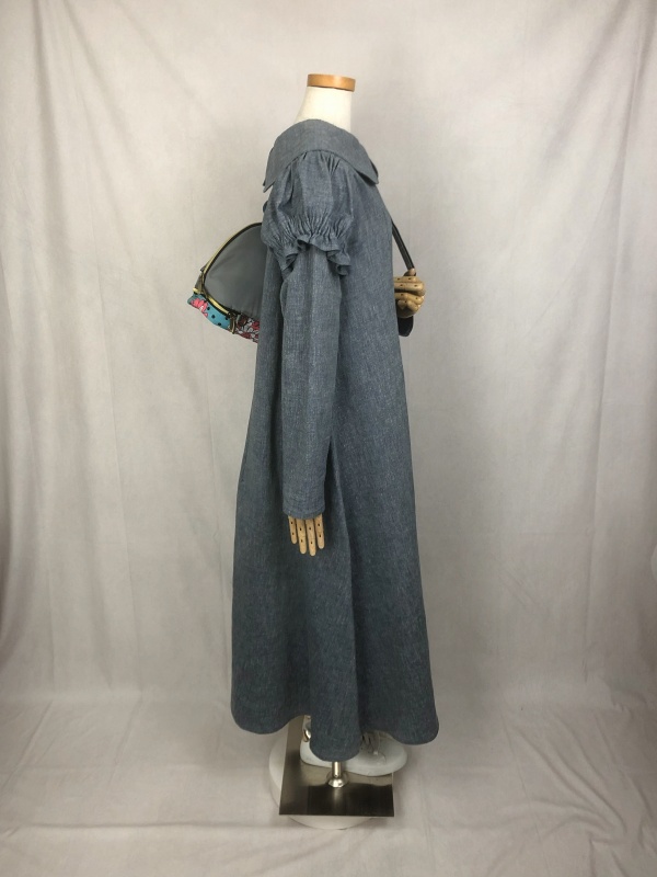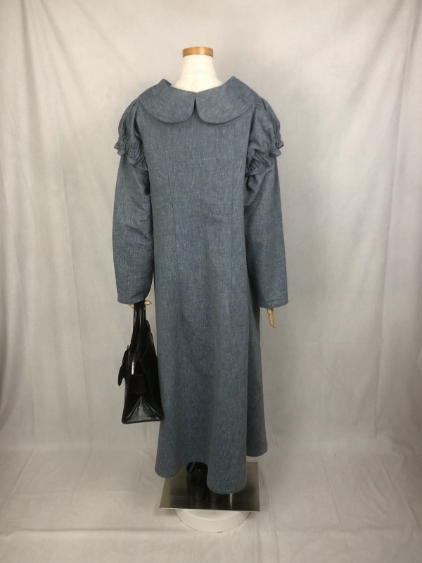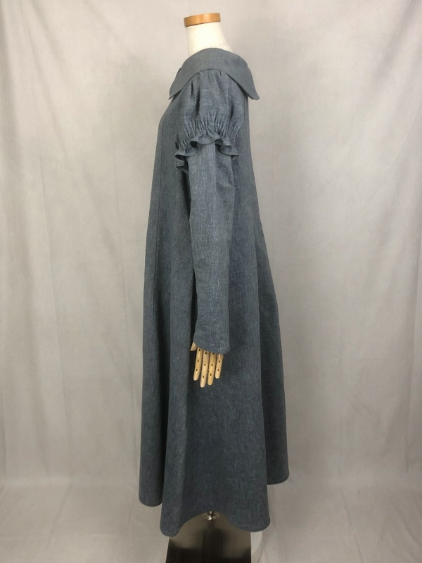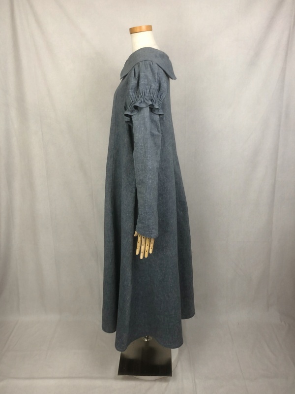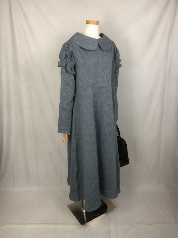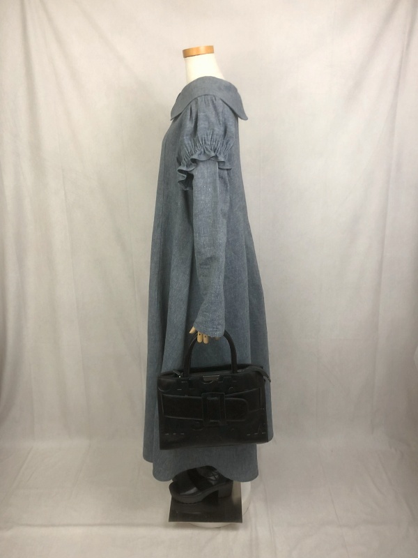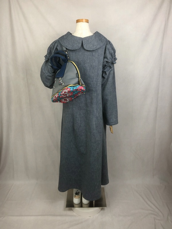 上腕の切替部分にフリルを施したダブルスリーブや、胸のプリンセスラインによって生まれるキレイなシルエットは、落ち着いたネイビーのデニム素材を使用し、マキシ丈に仕上げた上品なワンピースに、大人のかわいらしさを演出しています。