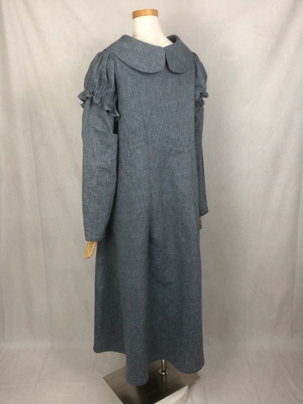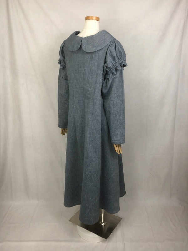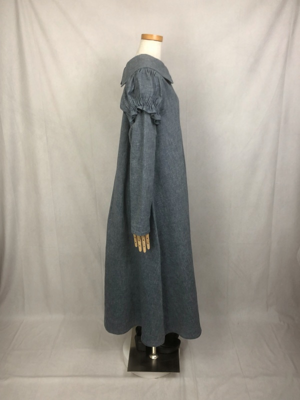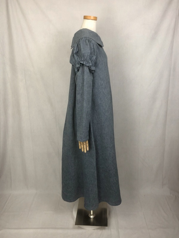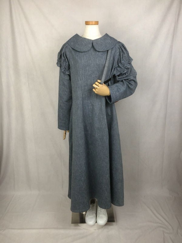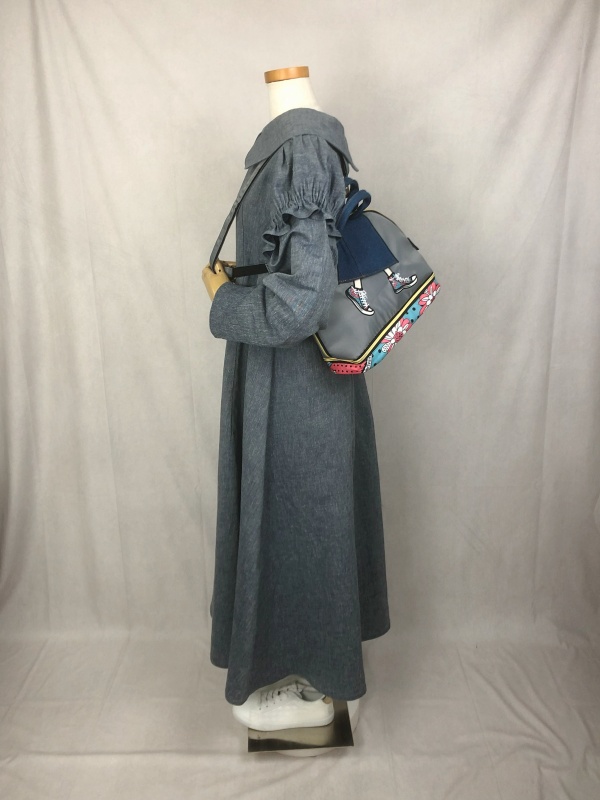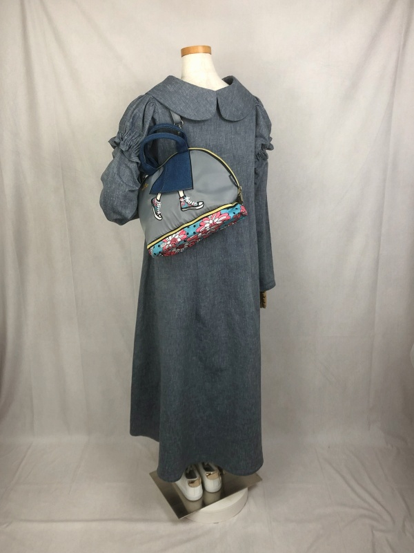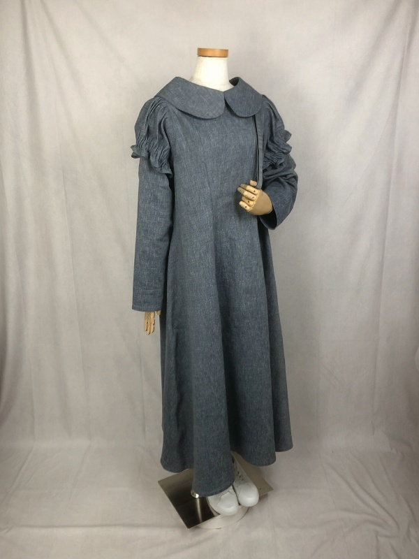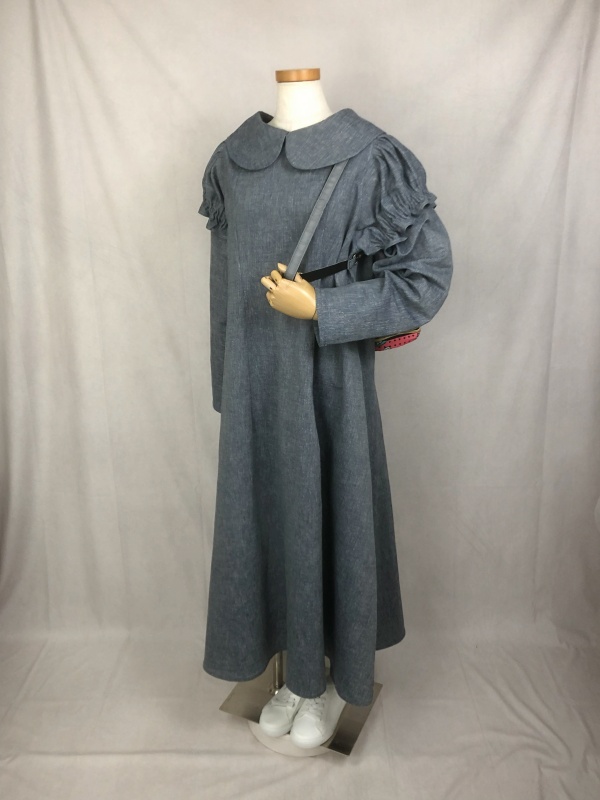 上腕の切替部分にフリルを施したダブルスリーブや、胸のプリンセスラインによって生まれるキレイなシルエットは、落ち着いたネイビーのデニム素材を使用し、マキシ丈に仕上げた上品なワンピースに、大人のかわいらしさを演出しています。
