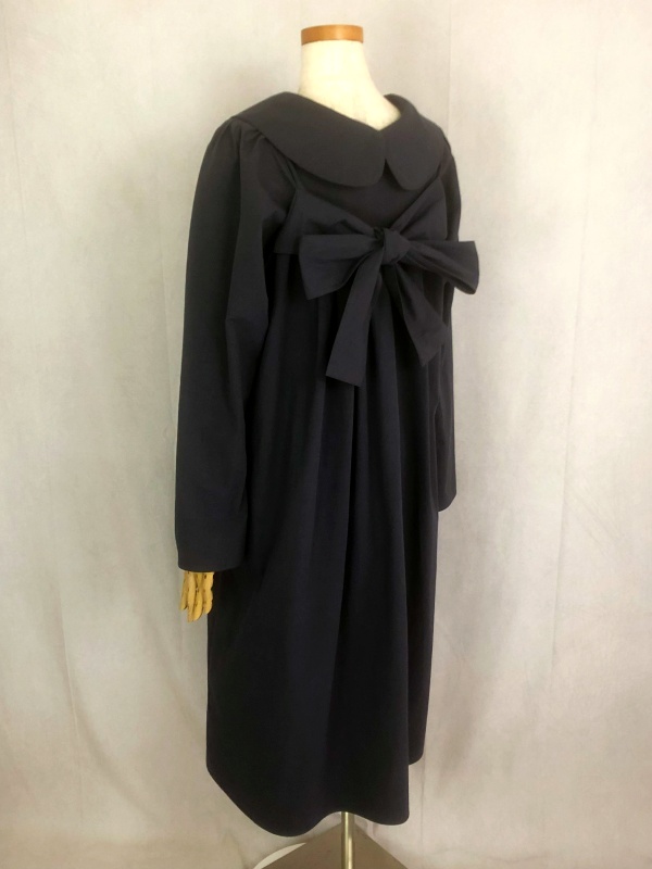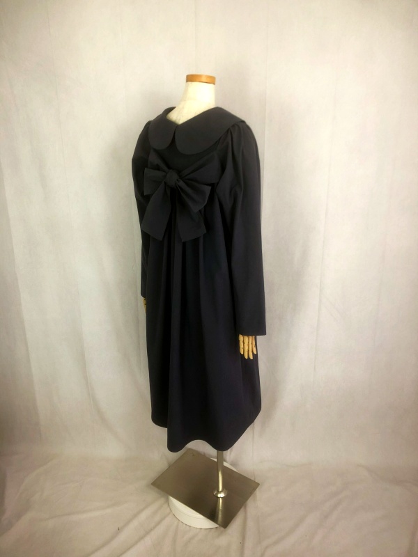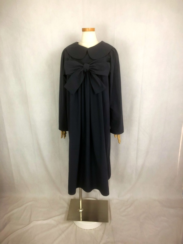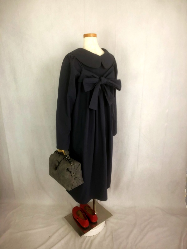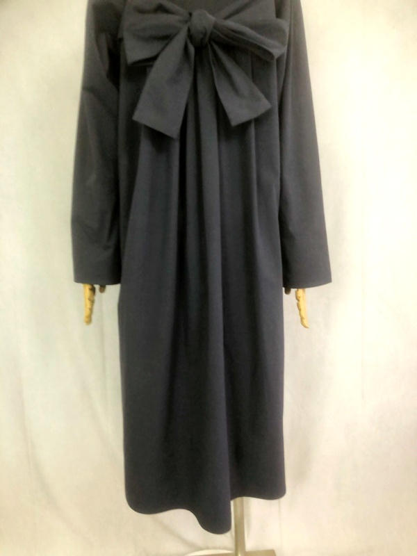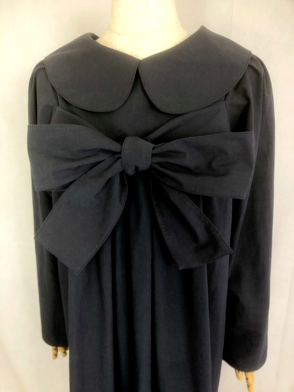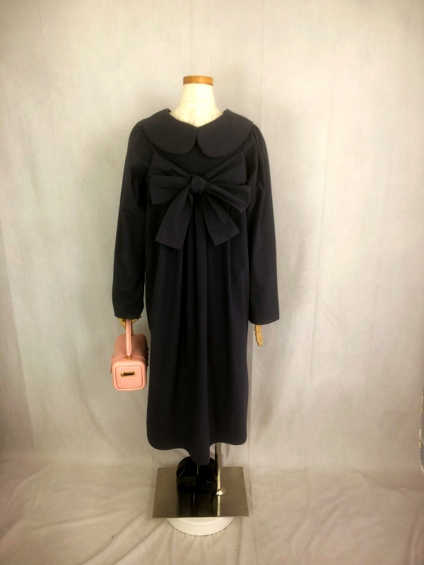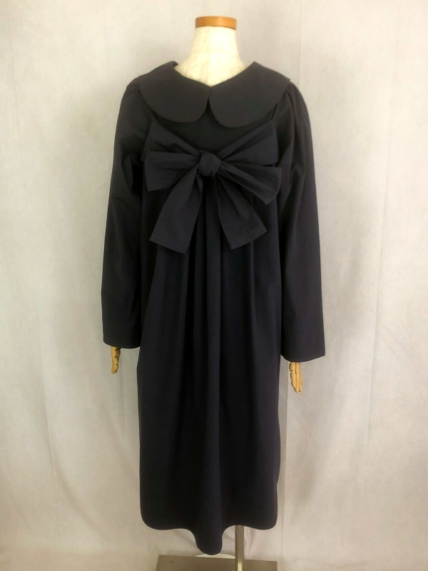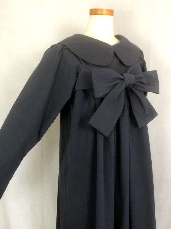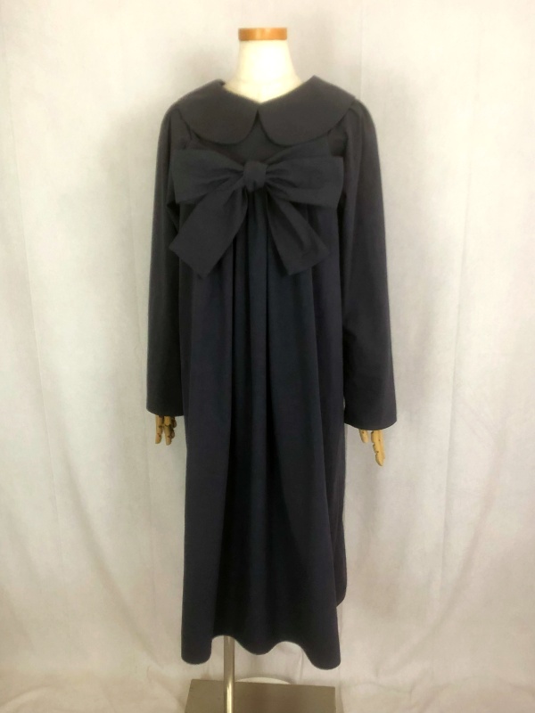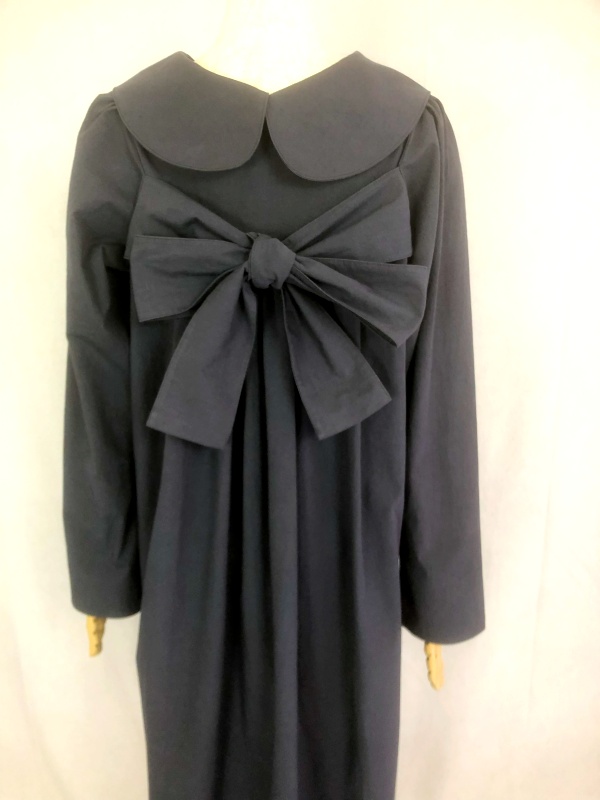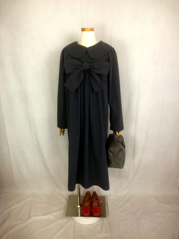 上質なシーチング生地を使用したコットン100%の丸襟ワンピースでございます。胸の位置に施したリボンを結んで生まれるシルエットは、チャコールグレーの落ち着いた色合いが見せる上品な雰囲気の中に、大人のかわいらしさを演出しています。リボンの結びを前後どちらに持ってきてもかわいい素敵なスタイルは、季節を問わず、様々なシーンで活躍しそうです。